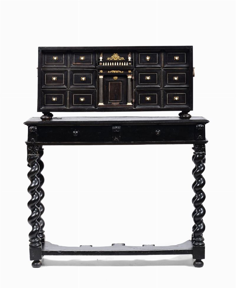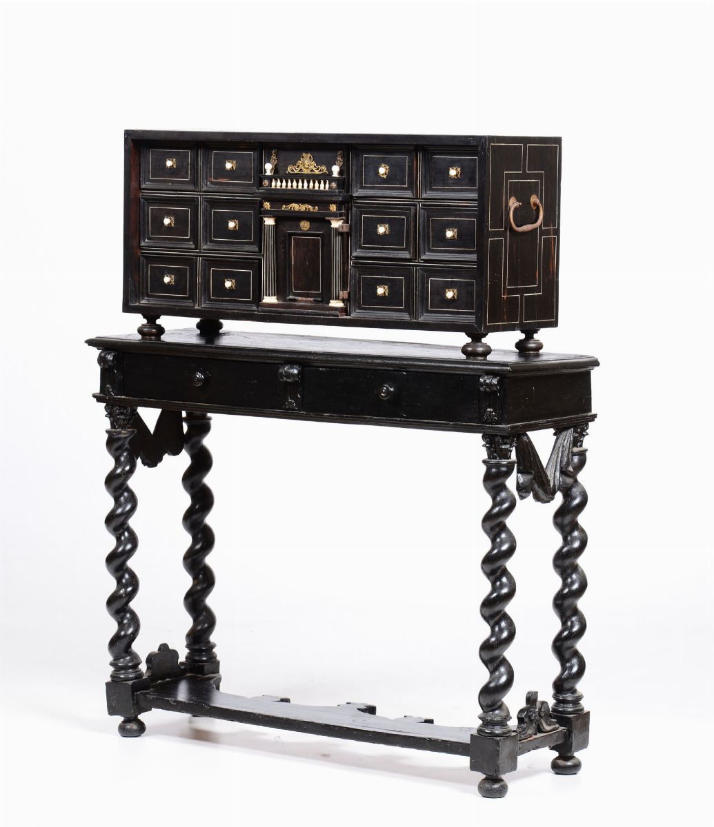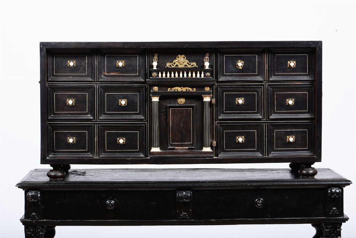Stipo monetiere in legno ebanizzato ed intarsiato in avorio, XIX secolo