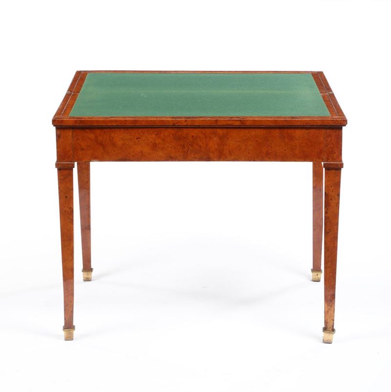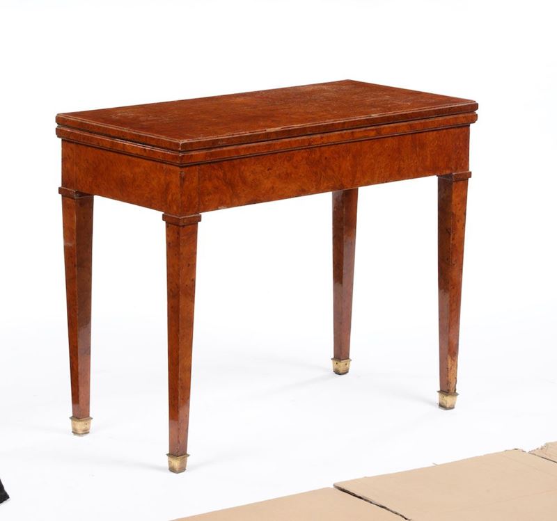 Tavolino da gioco con piano a libro lastronato in radica, XX secolo