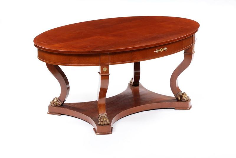 piano ovale, montanti arcuati terminanti con piede ferino poggiante su base sagomata, applicazioni di bronzi dorati, cm 173x114x76