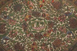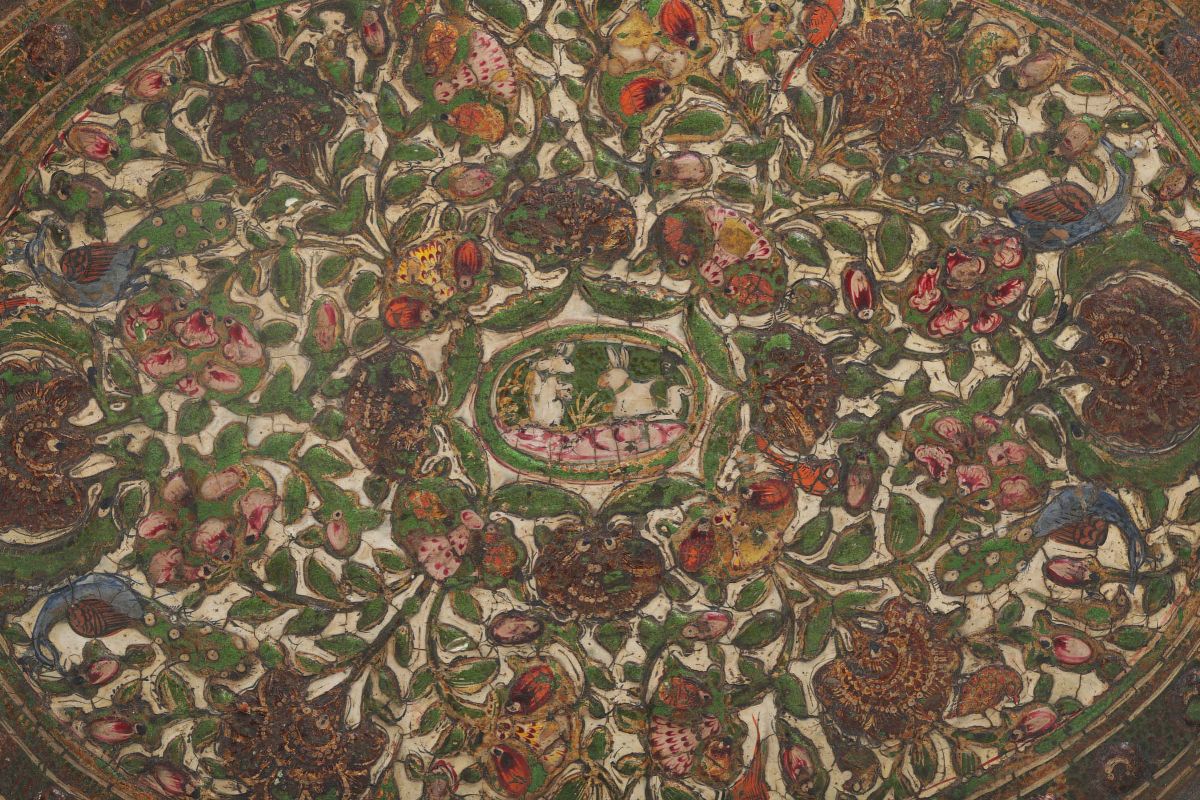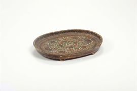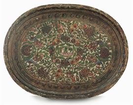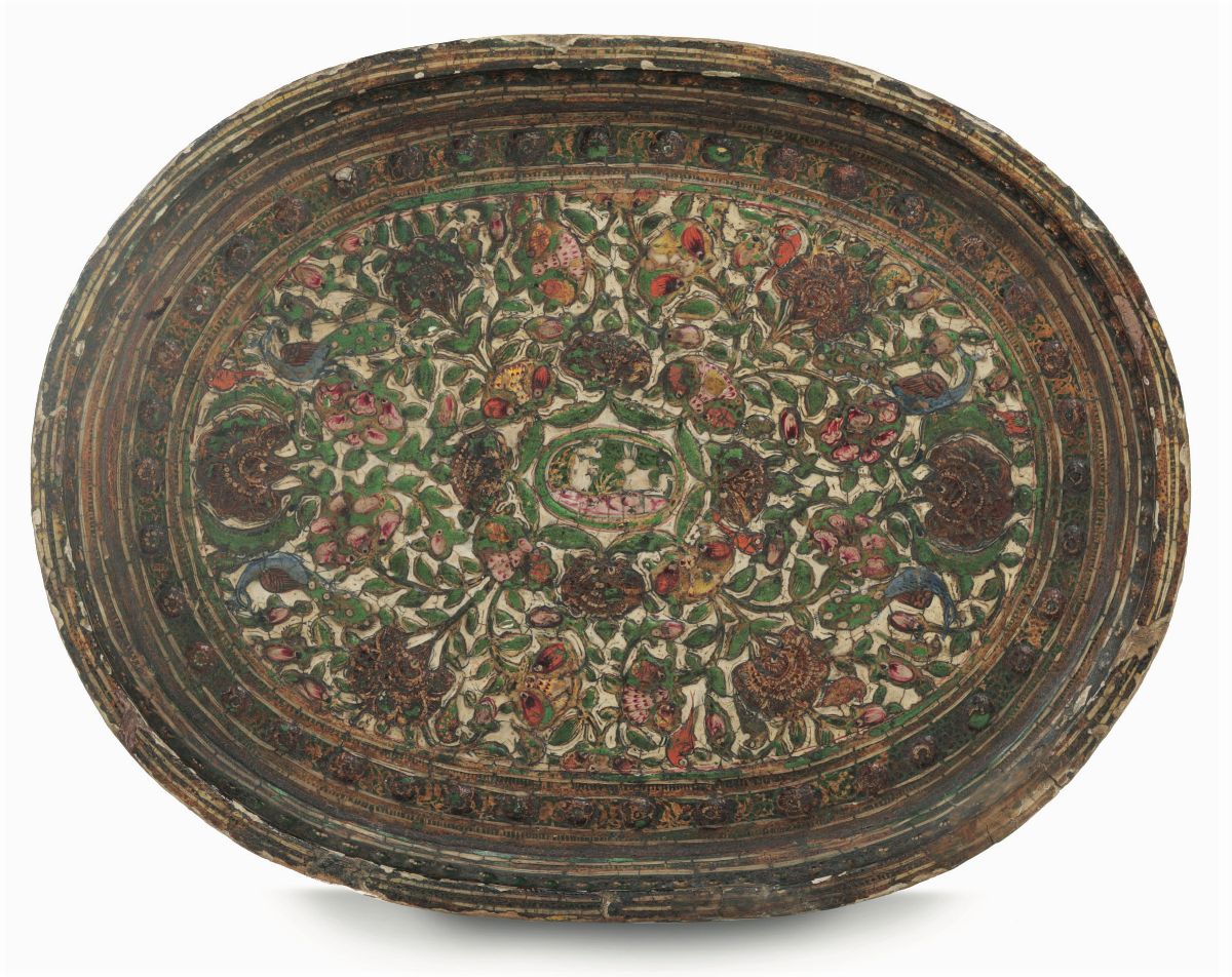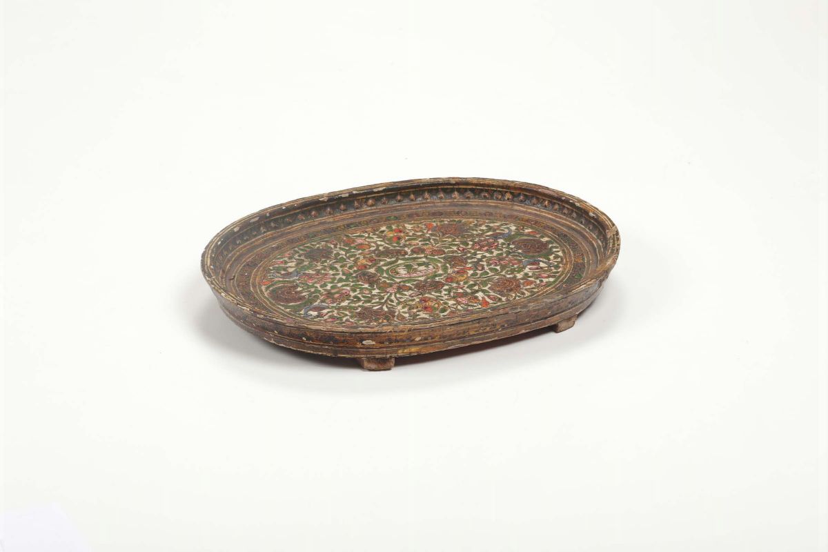 Vassoio ovale in legno laccato, decoro floreale a leggero rilievo. Persia, XVIII-XIX secolo