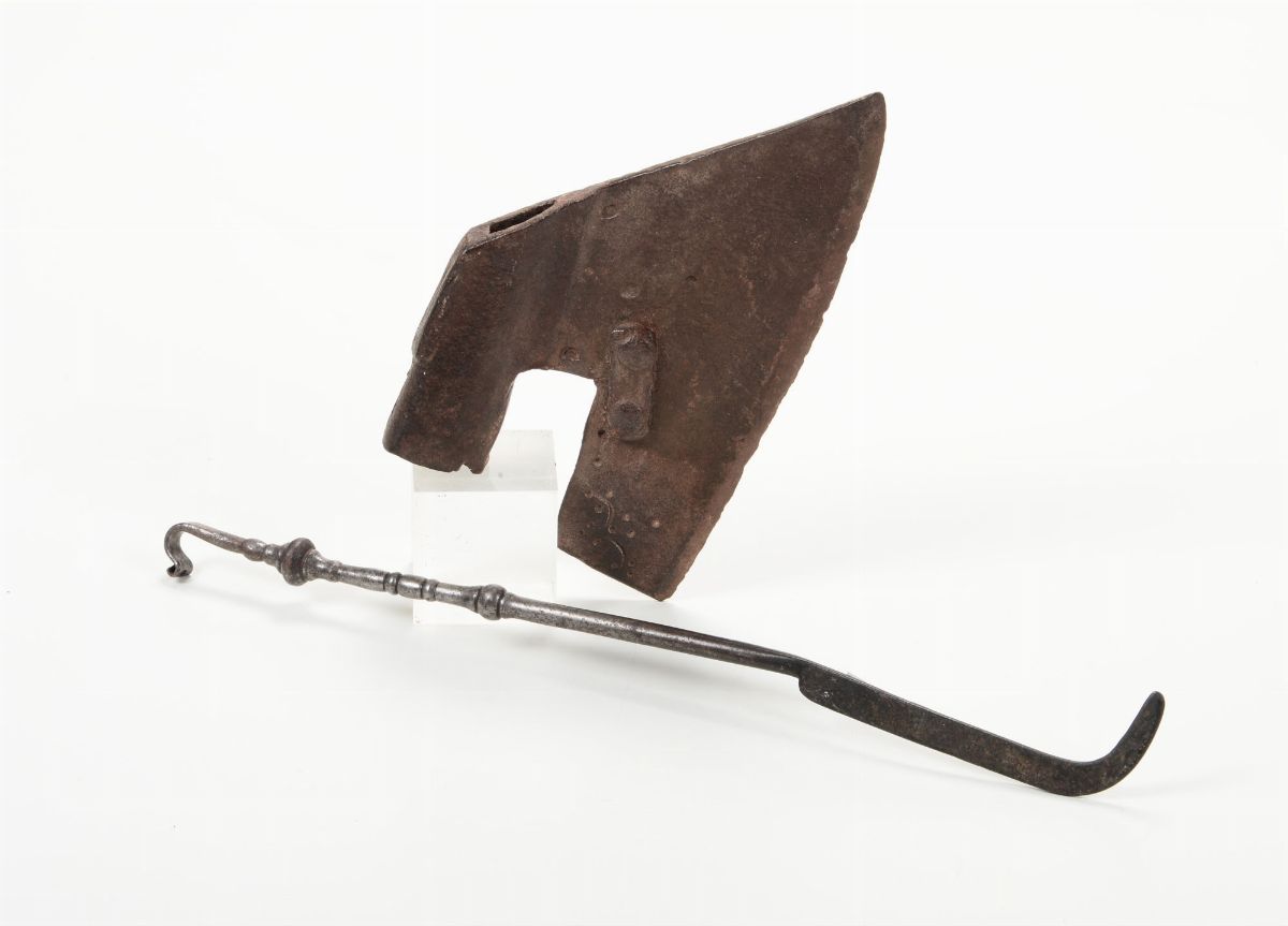 un'ascia e uno strumento con manico lavorato e lama ricurva probabilmente destinato al camino.
