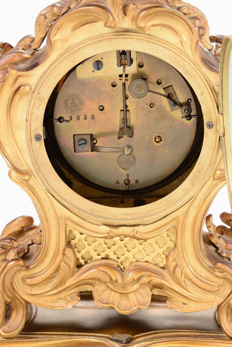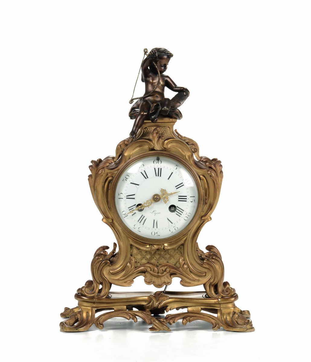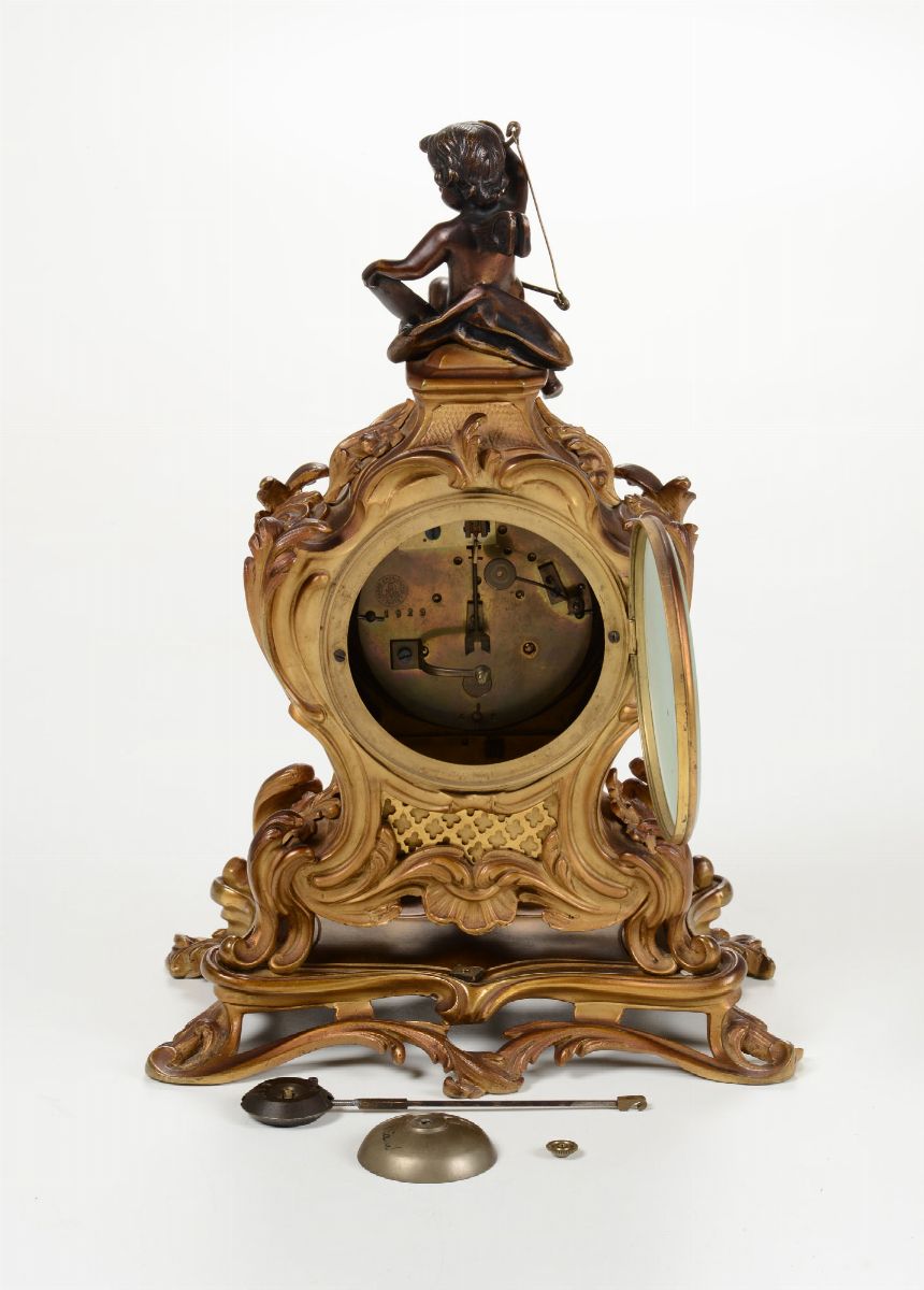 Cassa sagomata in bronzo dorato con amorino seduto sulla sommità, quadrante smaltato a numerazione romana per le ore e araba per la minuteria, altezza cm 36