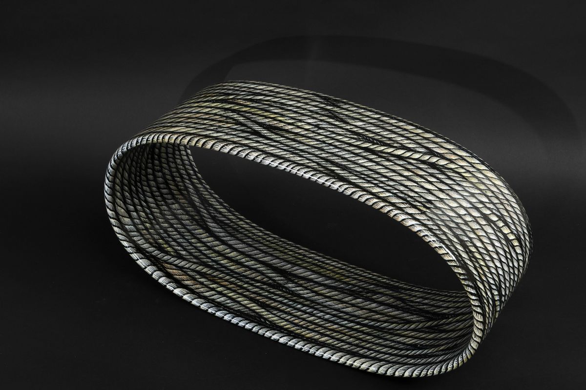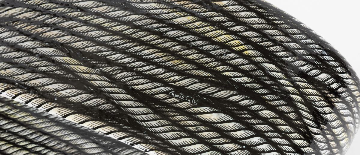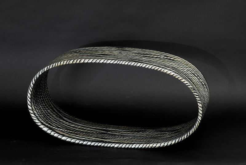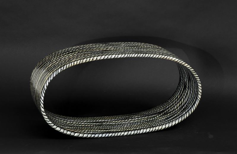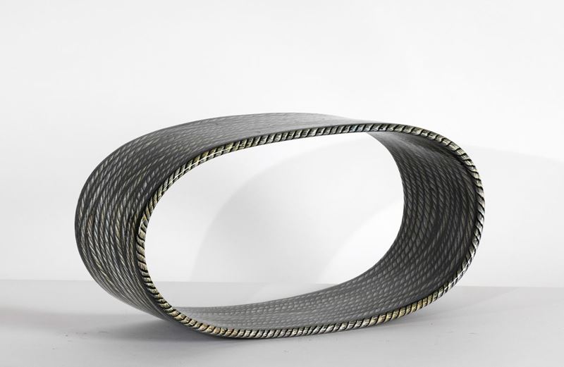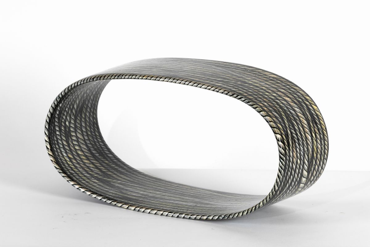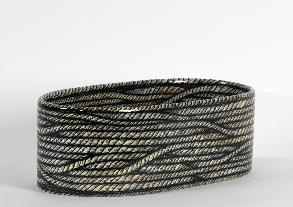 Scultura ad anello ovale in ceramica smaltata e dipinta a pennello.