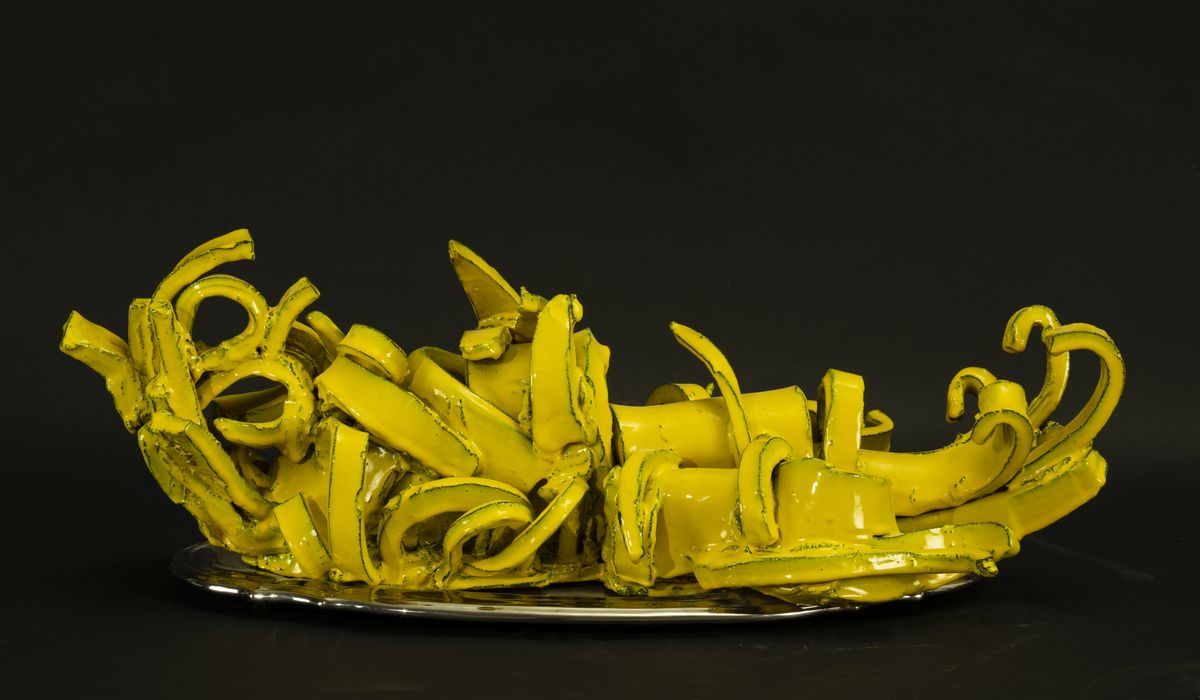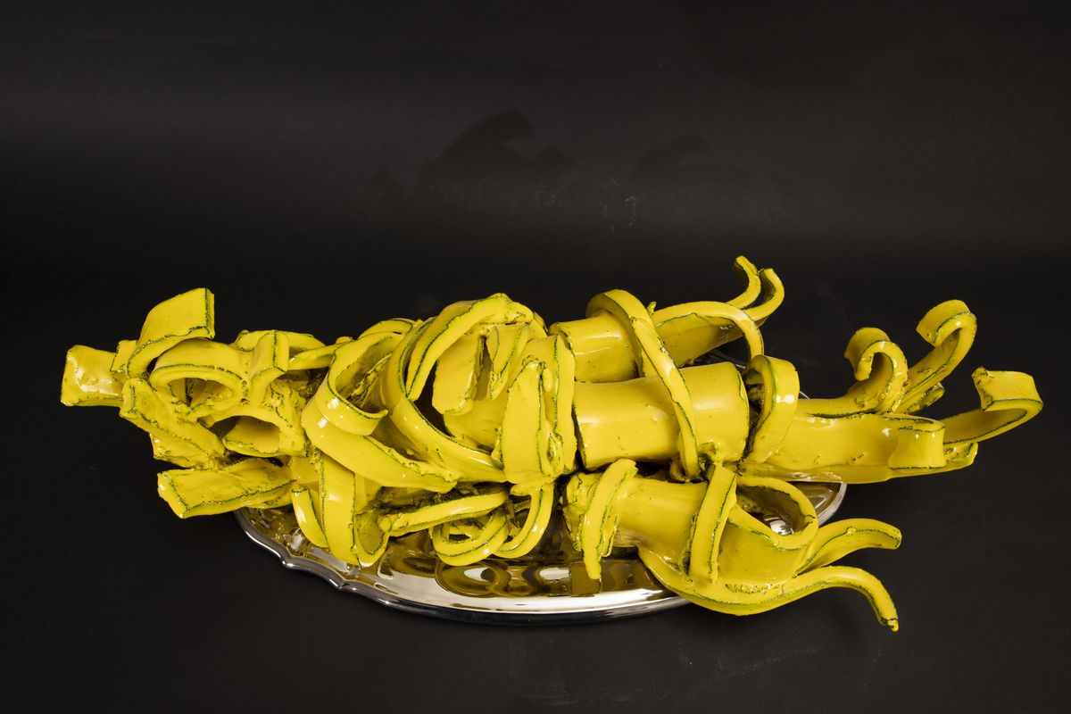 Grande scultura raffigurante aragosta su piatto platino in terracotta maiolicata gialla.