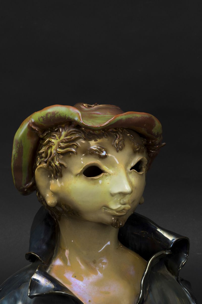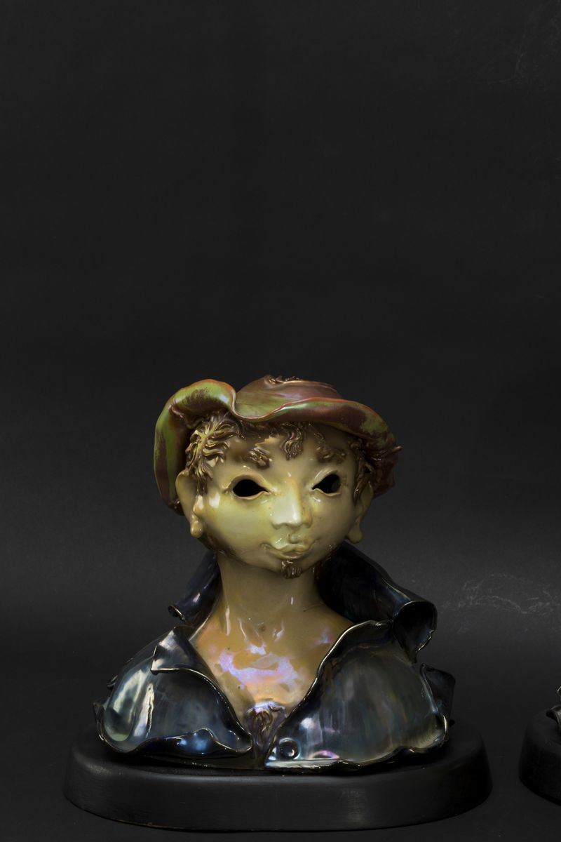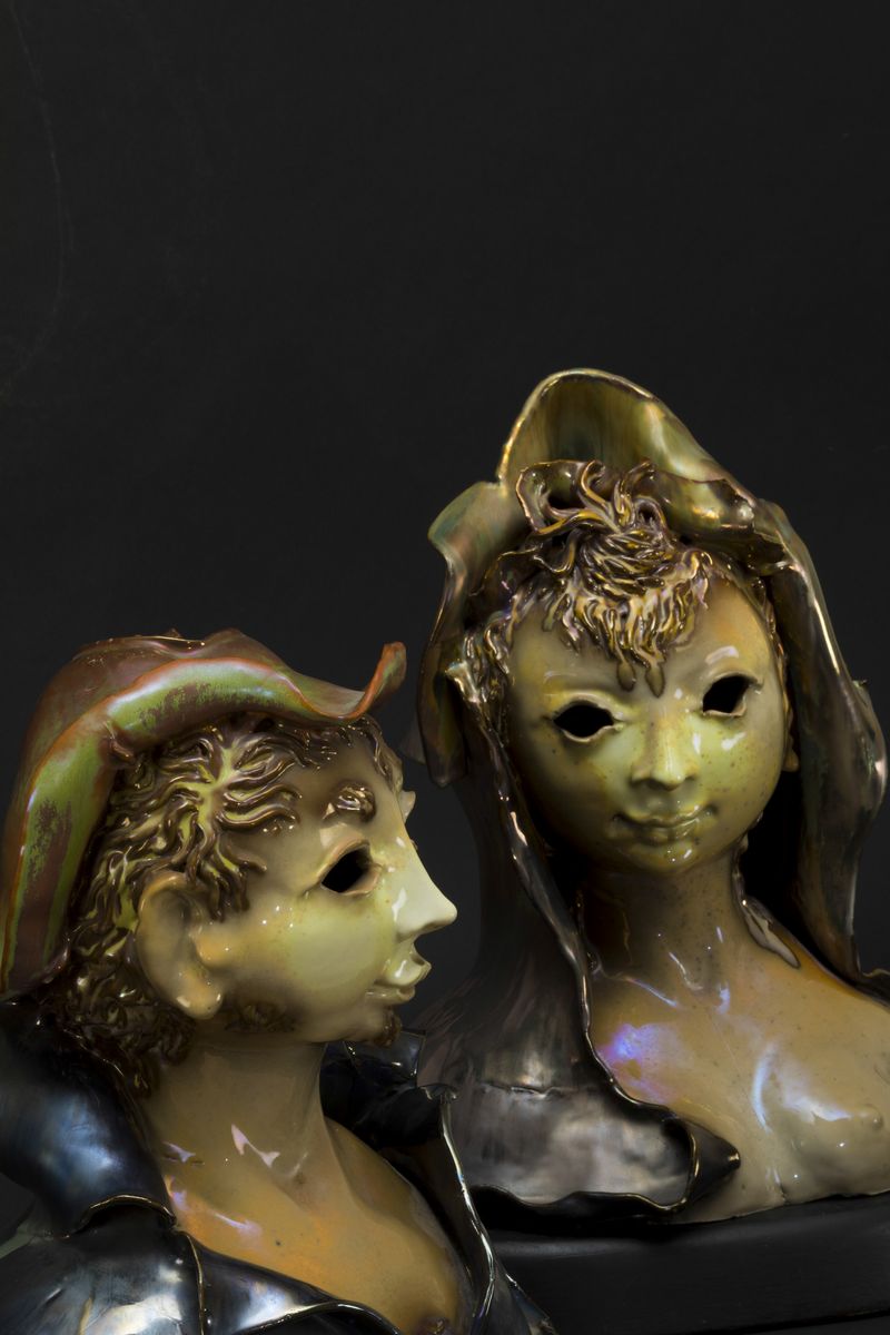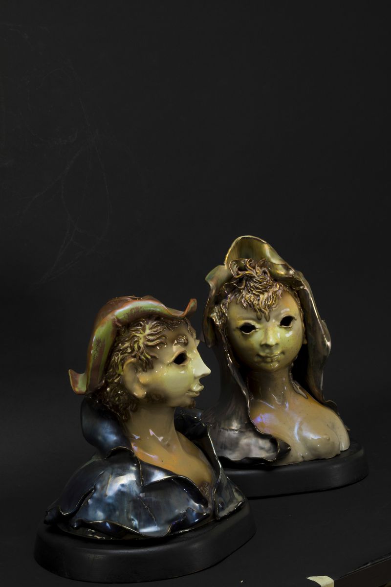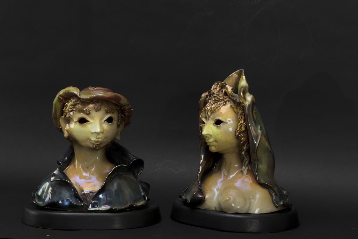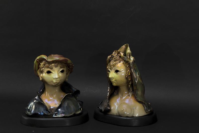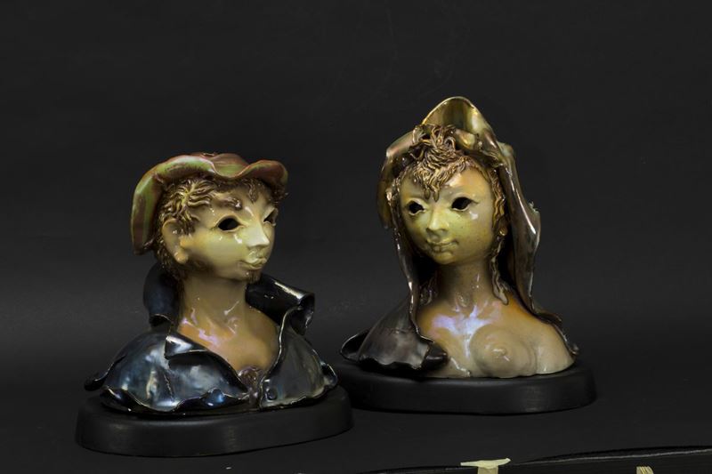 Coppia di busti modellati in ceramica con decoro policromo lustrato.