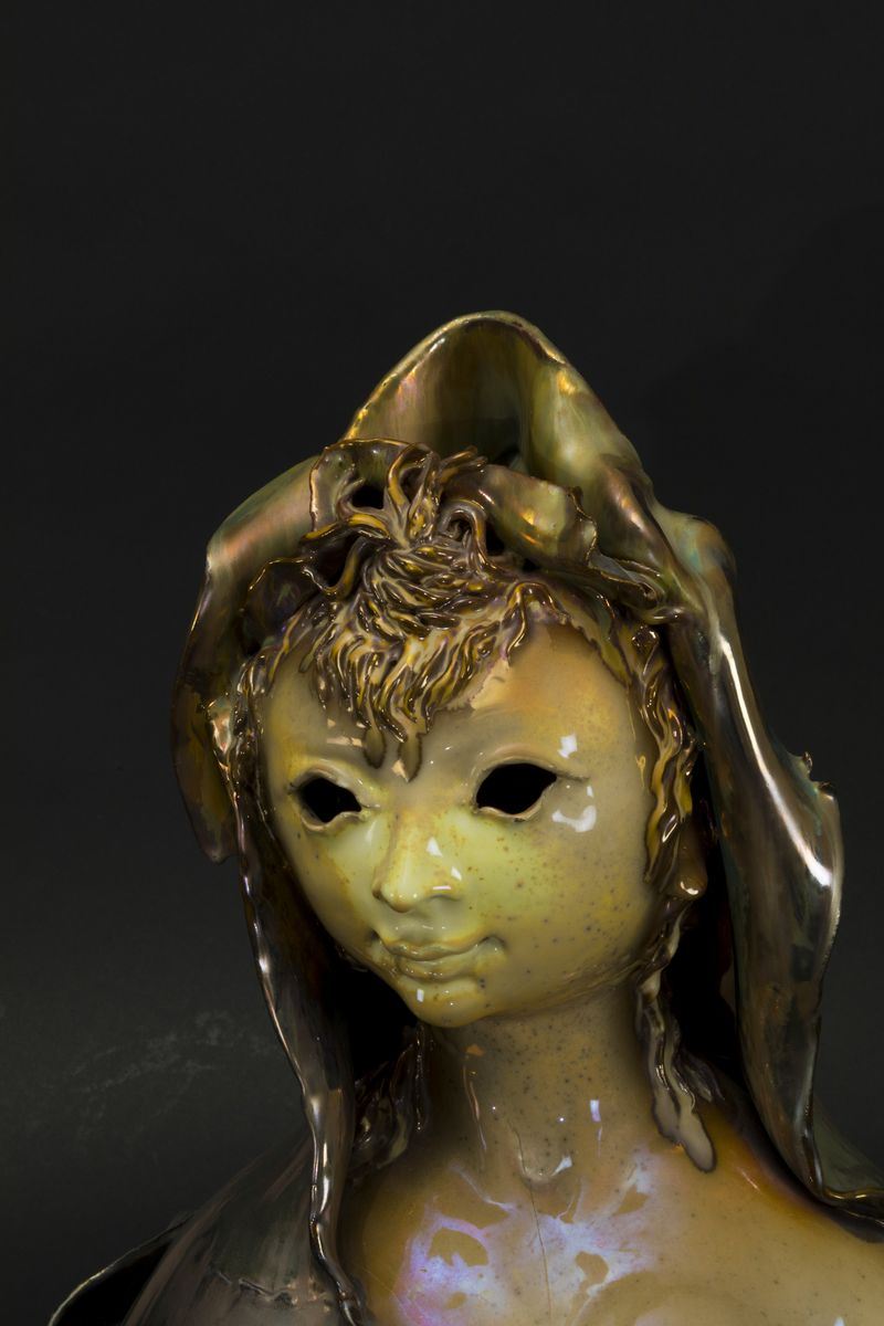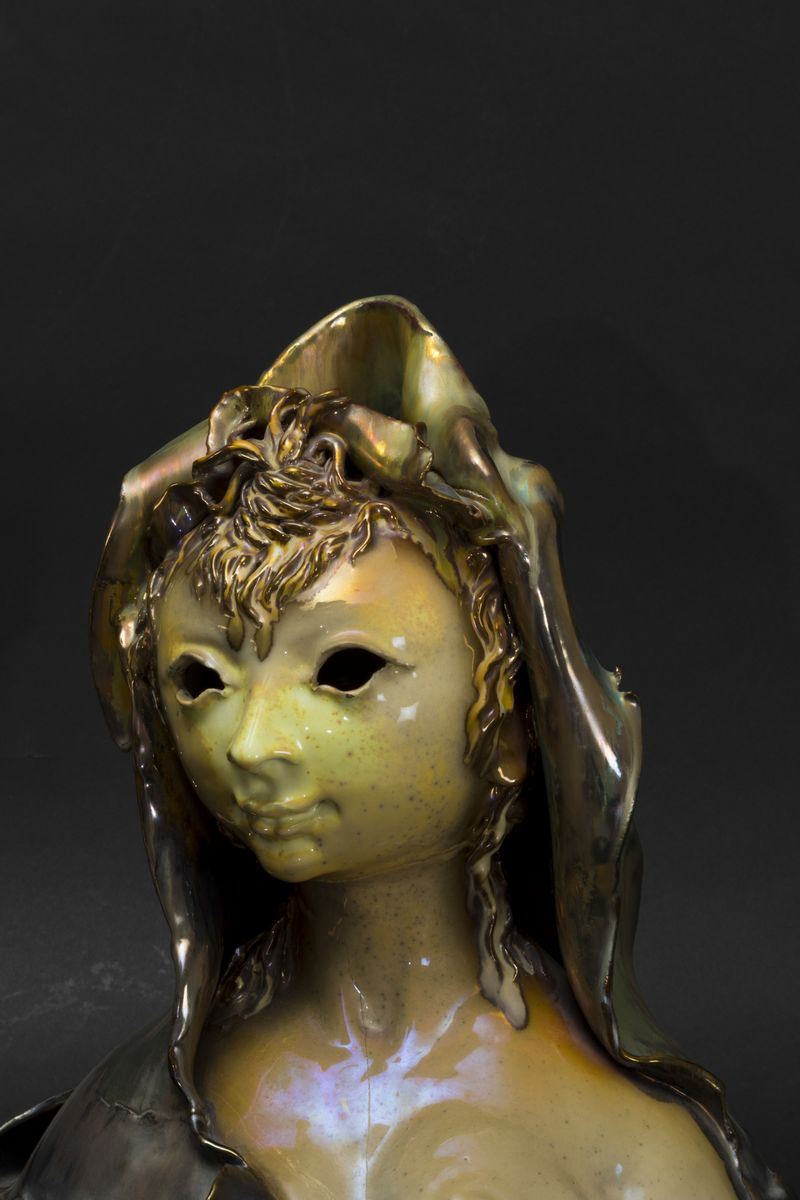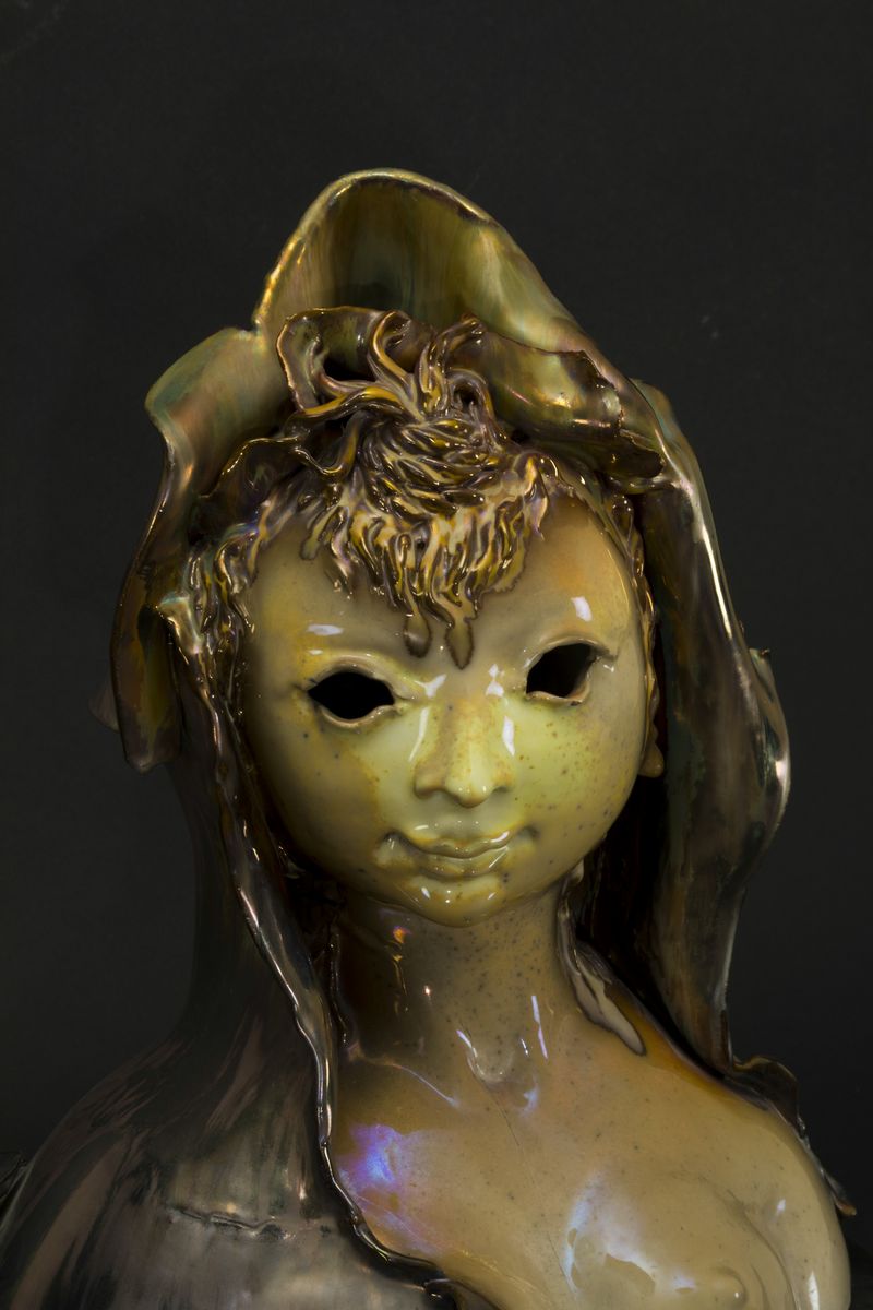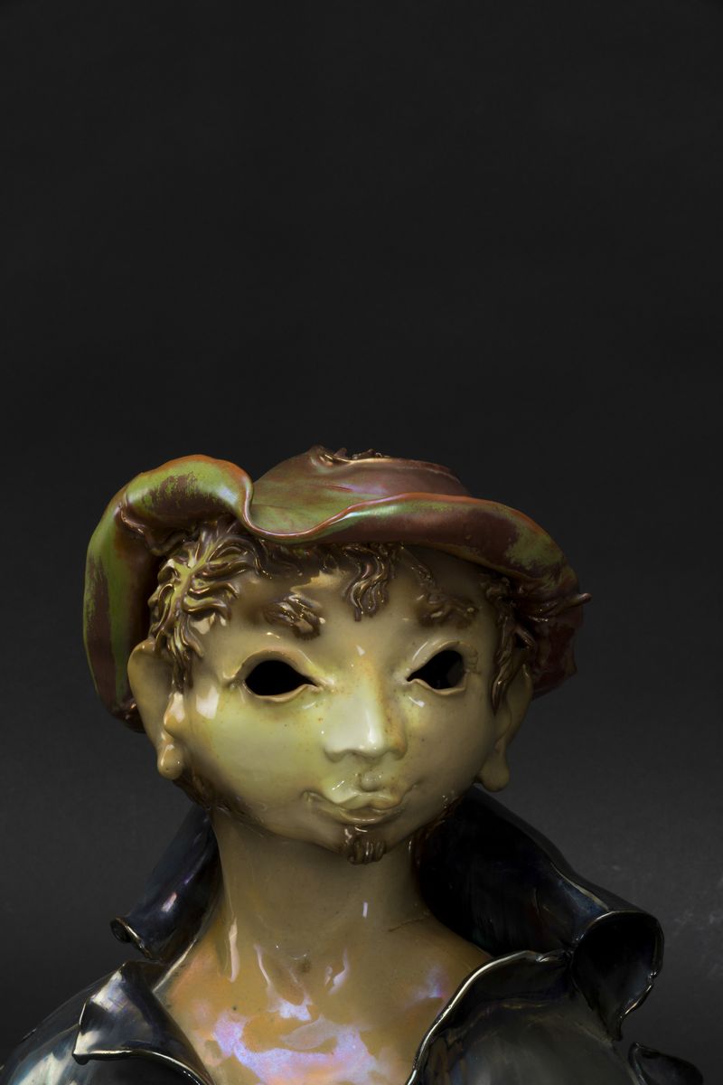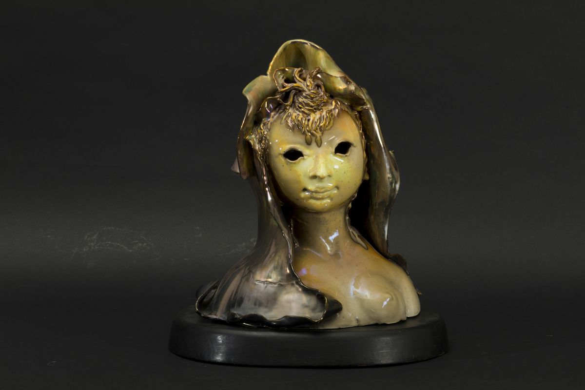 Coppia di busti modellati in ceramica con decoro policromo lustrato.