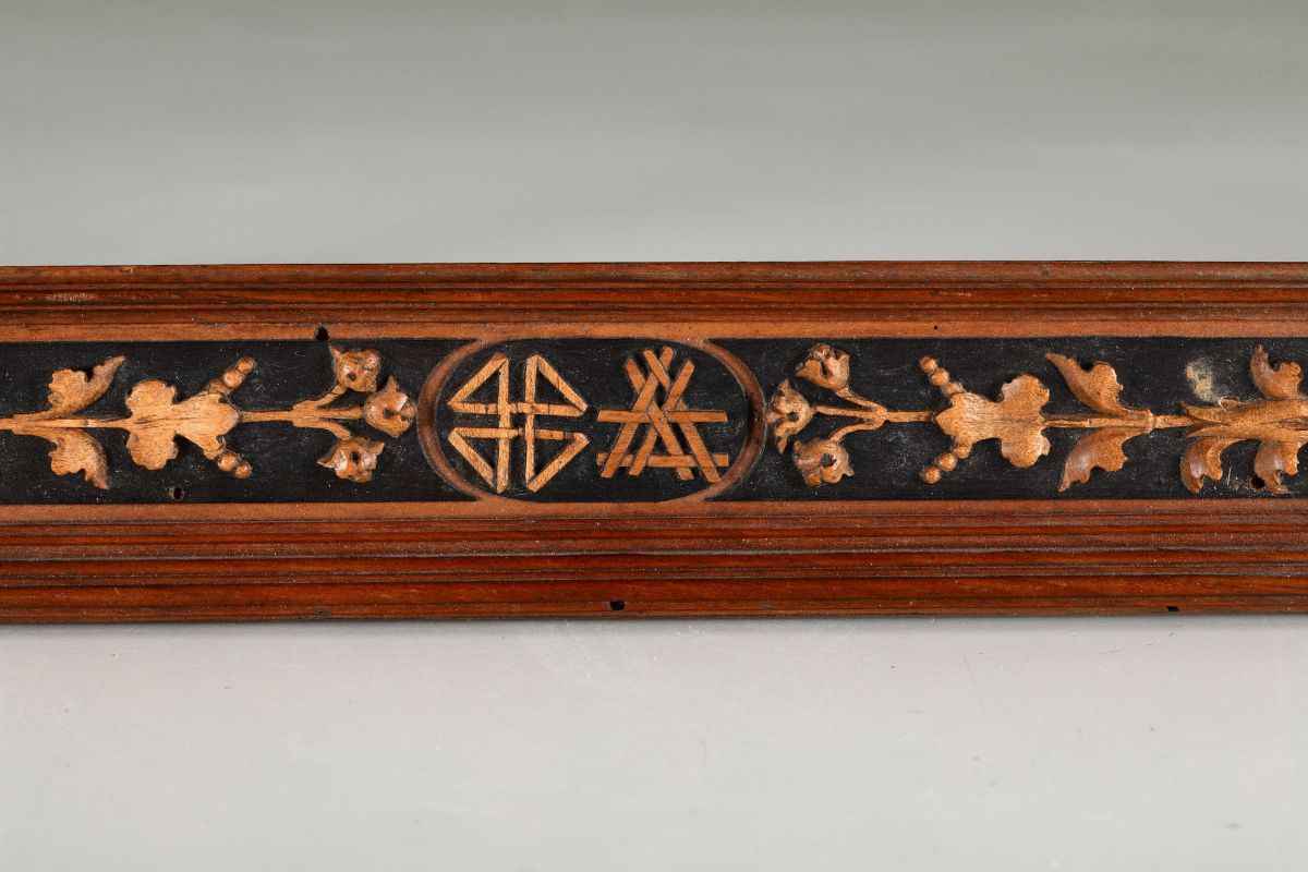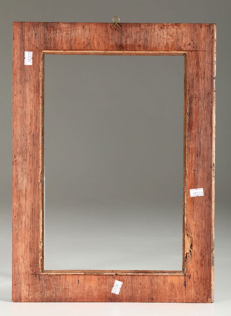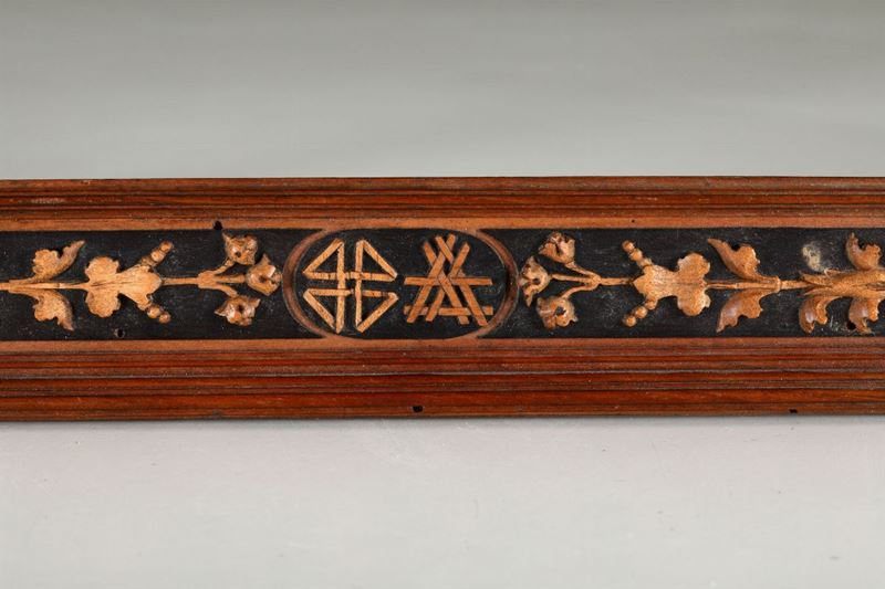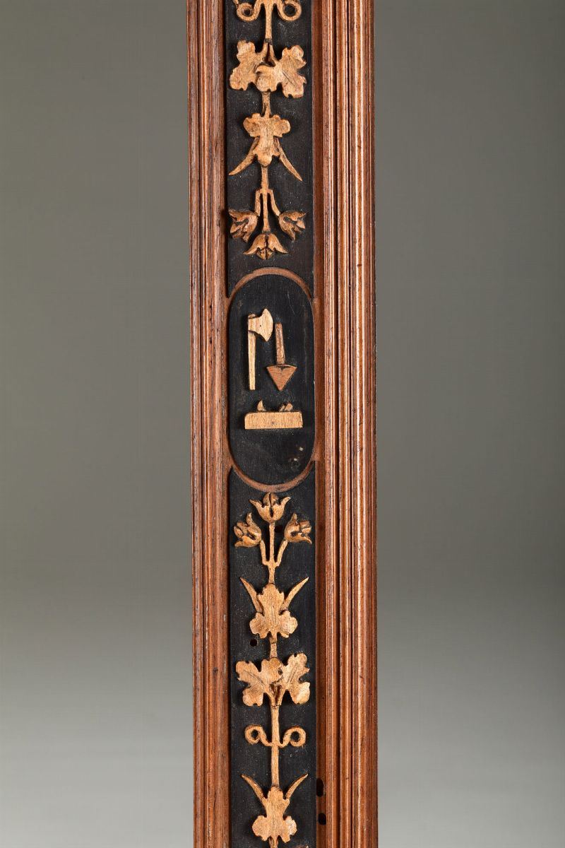 Cornice a forma rettangolare con profili modanati e da riserve ovali decorate ad intaglio minuto con motivi geometrici, frutta e strumenti di lavoro (ascia, pialla e cazzuola).