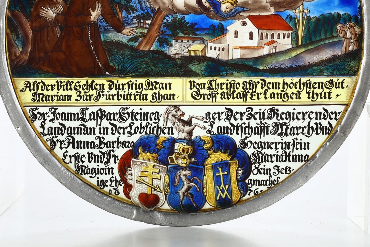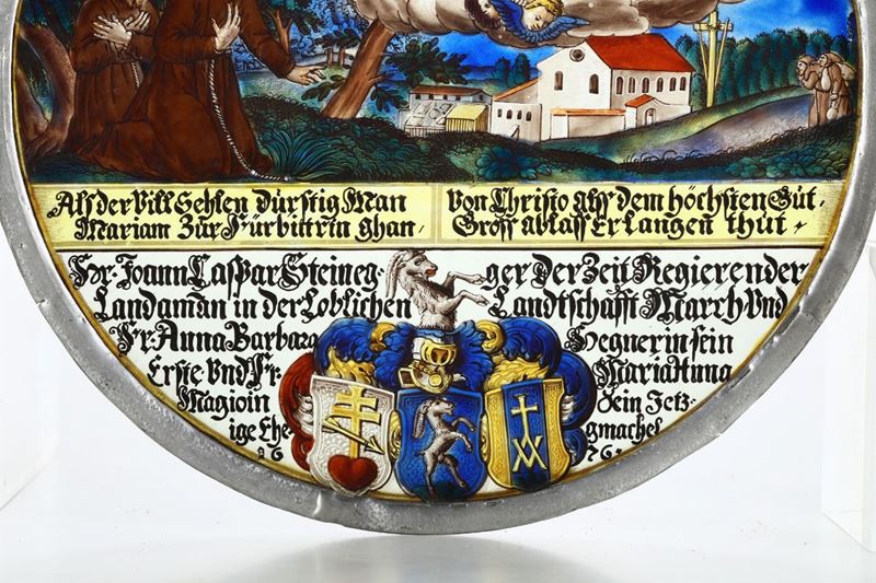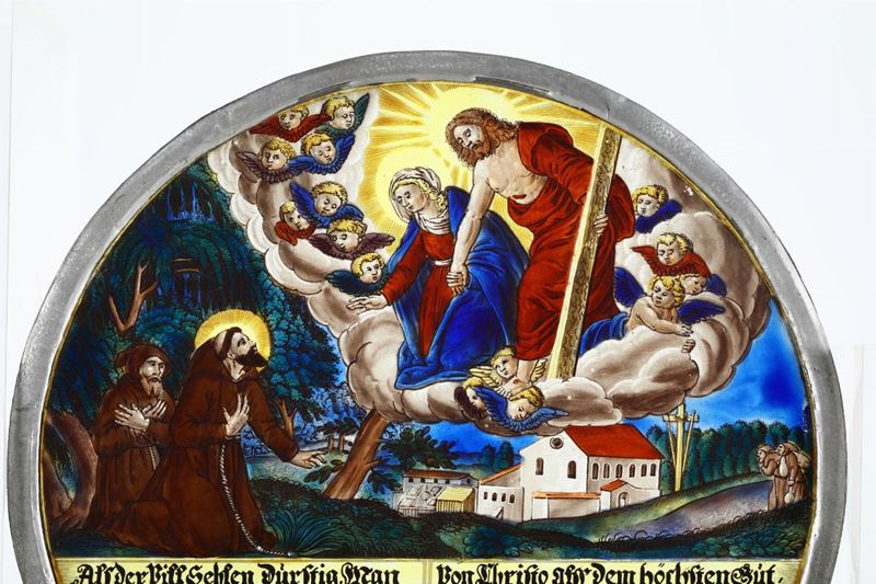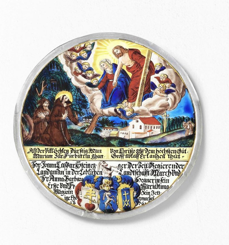 Panello circolare in vetro dipinto policromo. Germania o Austria probabile XVII secolo