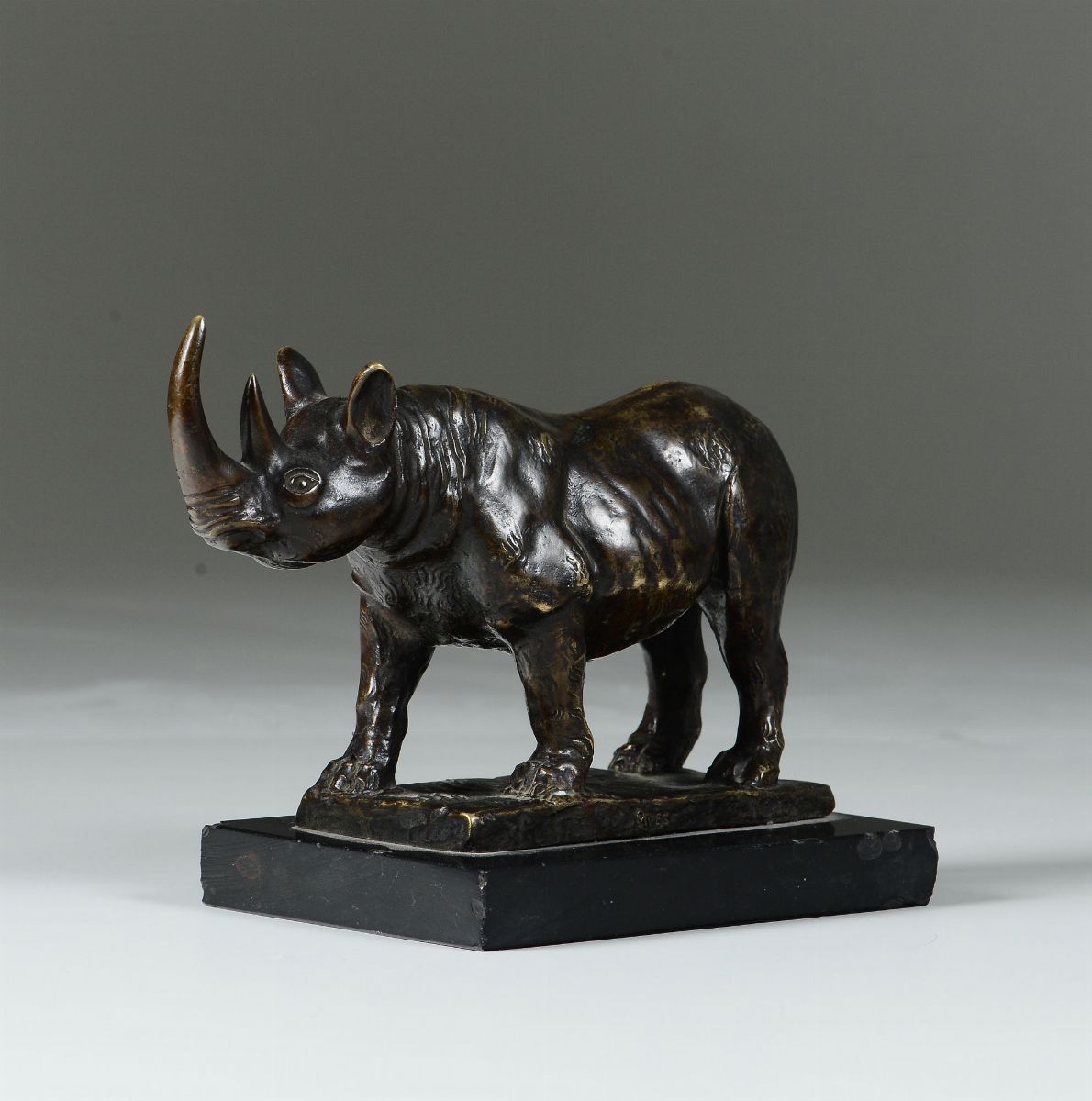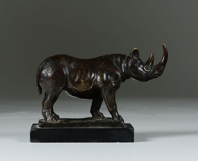 Rinoceronte. Bronzo fuso e cesellato. Base in marmo nero. Fonditore del XIX secolo