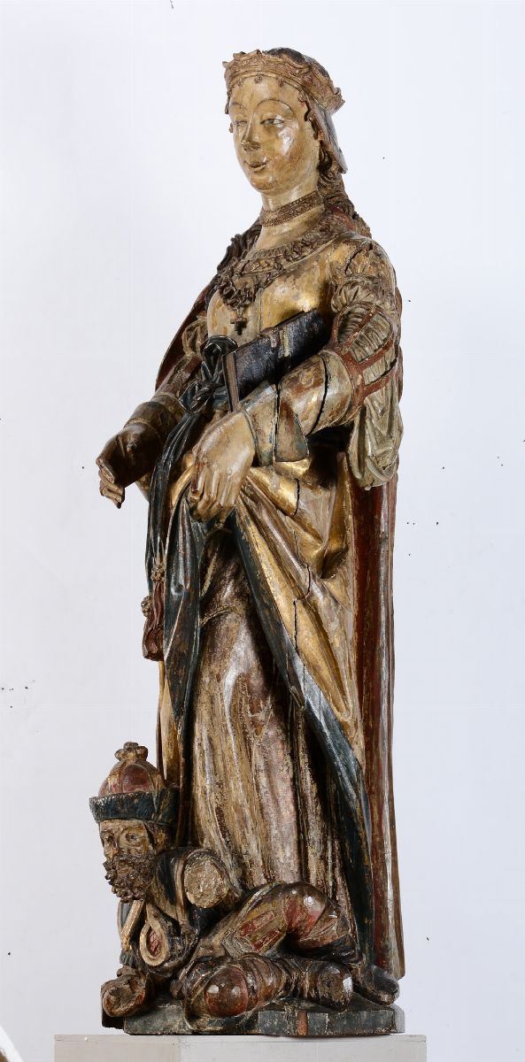 La Santa è qui raffigurata mentre sottomette l’Imperatore Messenzio che per averlo rifiutato come sposo ne ordinò il martirio un’iconografia molto attestata nelle Fiandre e in Francia già nel periodo gotico.