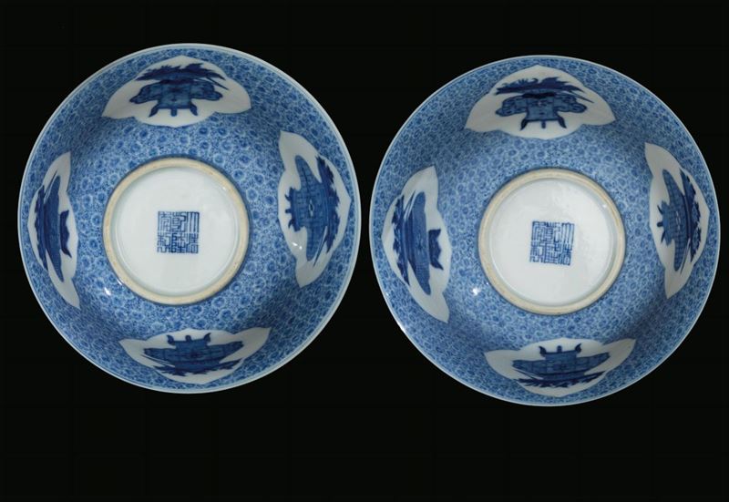 Coppia di ciotole in porcellana bianca e blu con decoro naturalistico entro riserve e stands in legno, Cina, Dinastia Qing, [..]