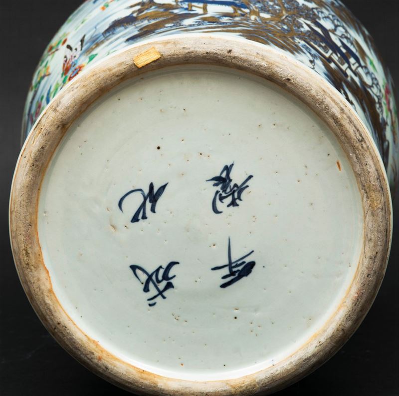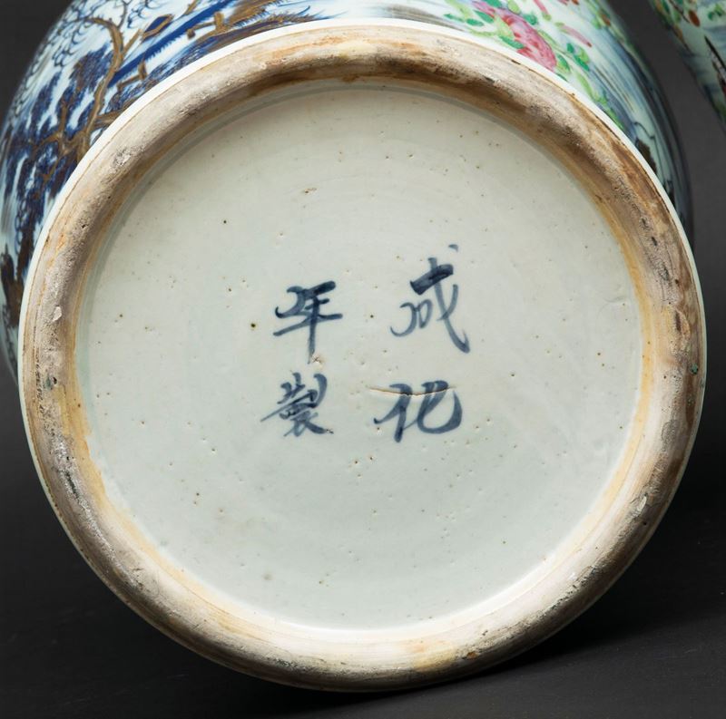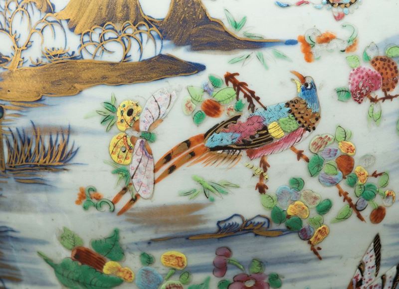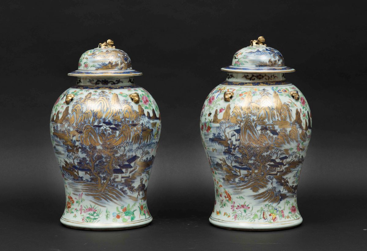 Coppia di potiches con coperchio in porcellana a smalti policromi e lumeggiature in oro con raffigurazioni di paesaggio lacustre, Cina, Dinastia Qing, XIX secolo