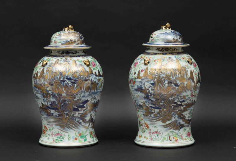 Coppia di potiches con coperchio in porcellana a smalti policromi e lumeggiature in oro con raffigurazioni di paesaggio [..]