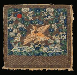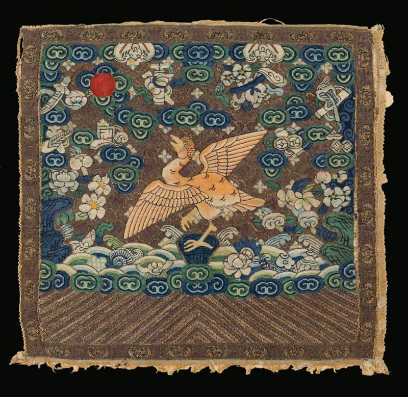 Coppia di tessuti in seta ricamata con figure di aironi entro cornice, Cina, Dinastia Qing, XIX secolo