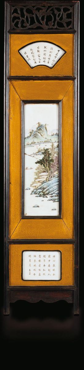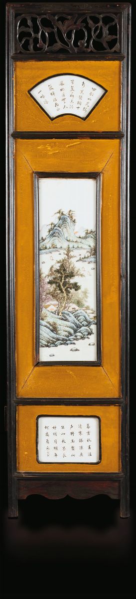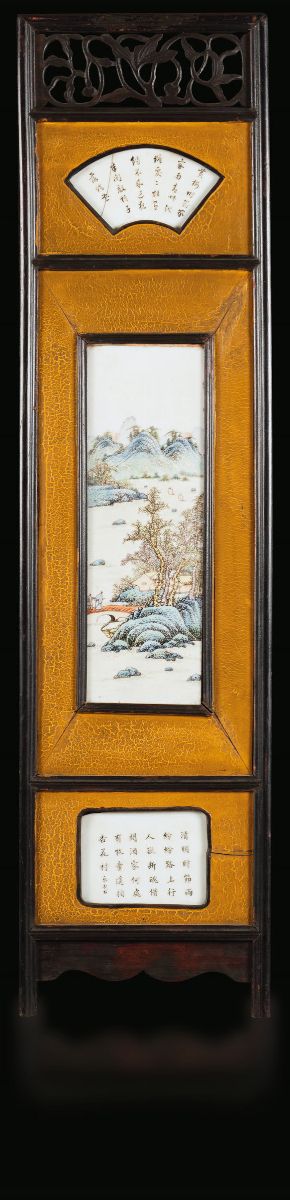 Piccolo paravento a quattro ante con placche in porcellana a smalti policromi raffiguranti paesaggi e iscrizioni, Cina, [..]