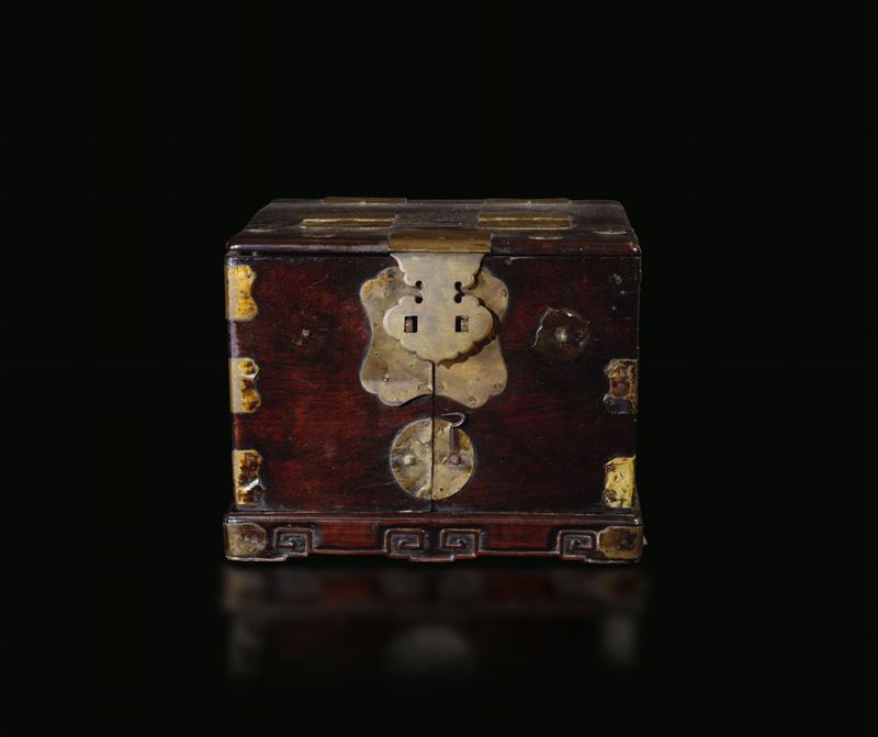 Piccolo stipo in legno Huanghuali con decori geometrici e dettagli in ottone dorato, Cina, XIX secolo