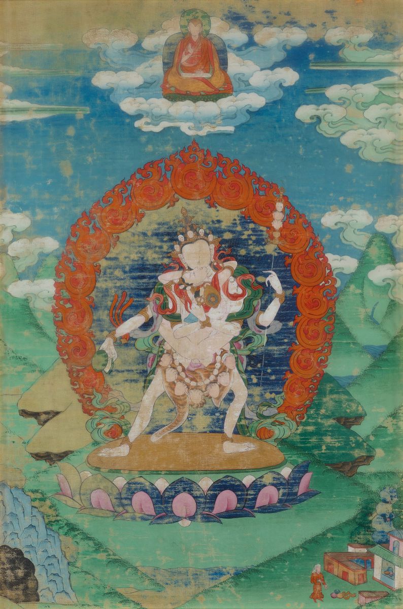 Thangka su seta entro cornice con figura centrale di divinità in Yab-Yum sovrastata da Buddha, Tibet, XIX secolo