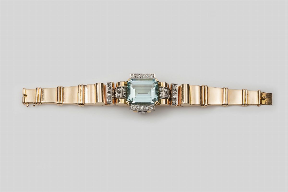 Bracciale con grande acquamarina e diamanti di vecchio taglio