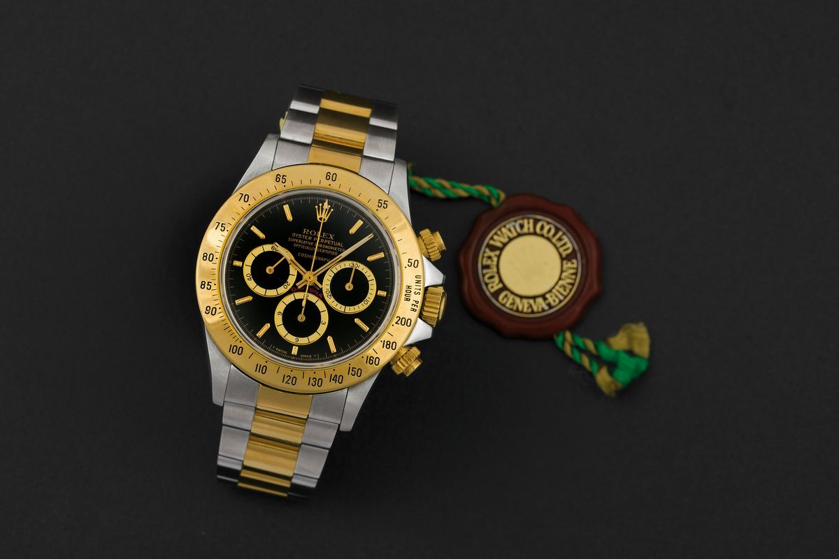 ROLEX, Oyster Perpetual, Superlative Chronometer, Officially Certified, Cosmograph, Daytona, Floating Cosmograph, cassa No. R985554 , Ref. 16523. Raro, orologio da polso, in acciaio e oro, impermeabile, automatico, cronografo con bracciale originale Rolex in acciaio e oro con chiusura deployante. Accompagnato dalla Garanzia originale. Realizzato nel 1989.