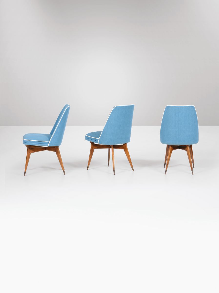 Sei sedie in legno con puntali in ottone e rivestimento in tessuto. Disegno originale per una villa privata a Fregene. Dichiarazione di autenticità eredi Bega.