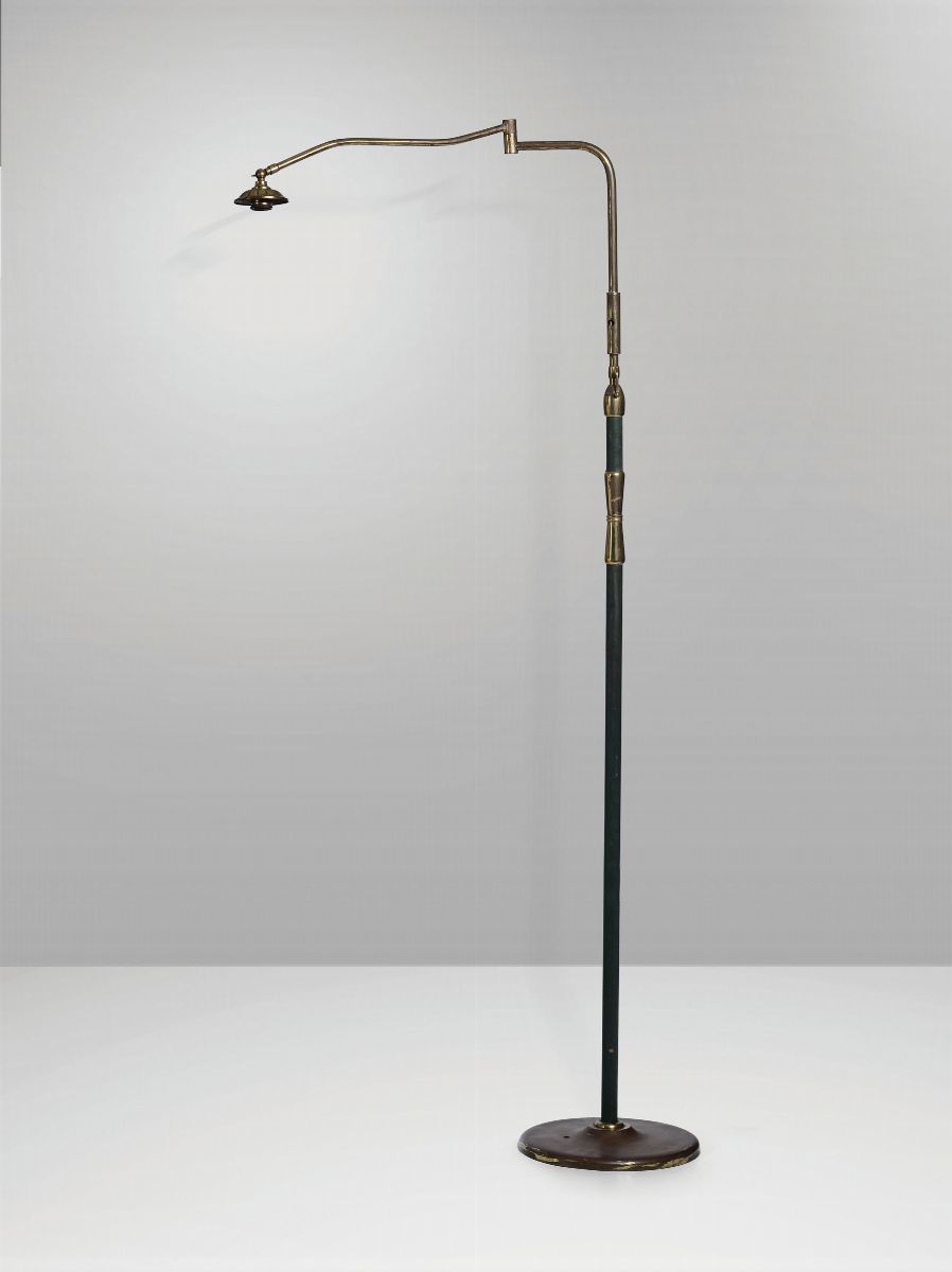 Lampada da terra con struttura in ottone con rivestimenti in pelle.