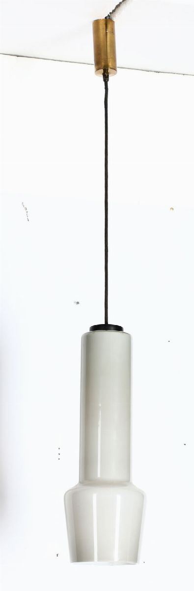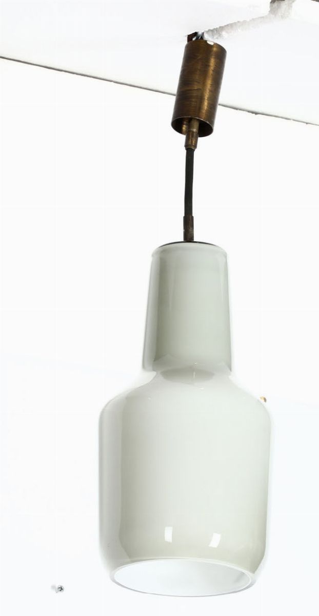 Set di tre sospensioni con struttura in ottone e diffusore in vetro opalino.