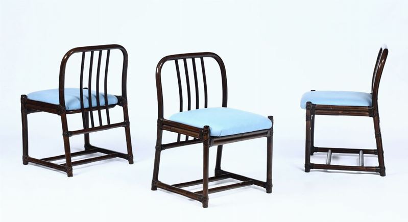 Dodici sedie con struttura in bamboo laccato e seduta in tessuto.