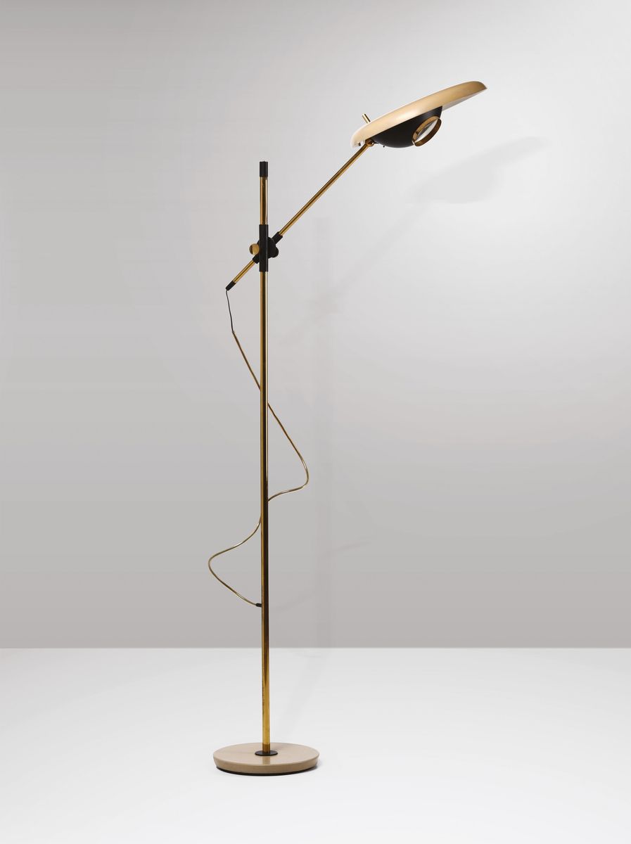 Lampada da terra mod. 555T con struttura in alluminio laccato, ottone e diffusore in vetro.