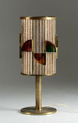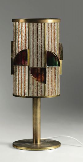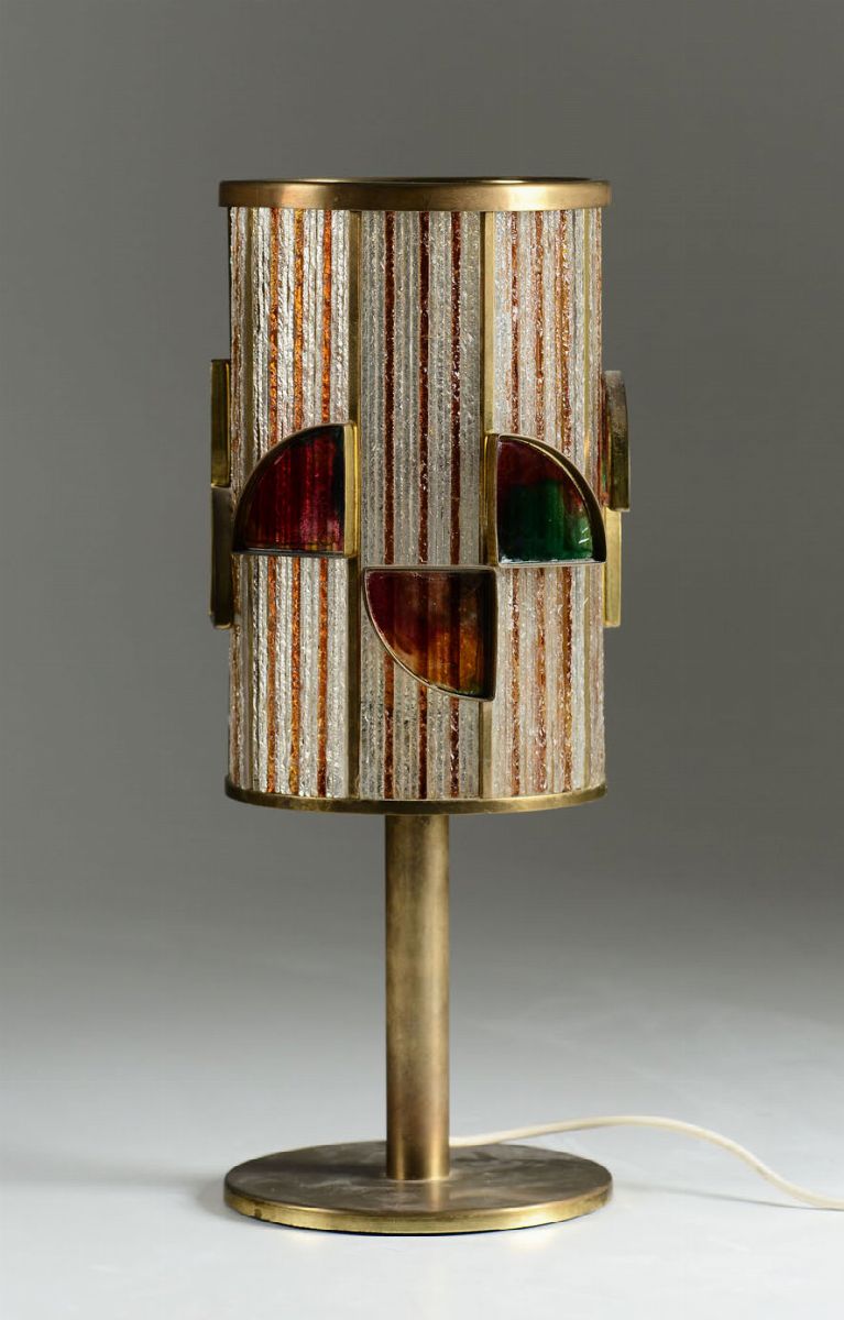 Lampada da tavolo con struttura in ottone e diffusori in vetro colorato e vetro scalpellato.