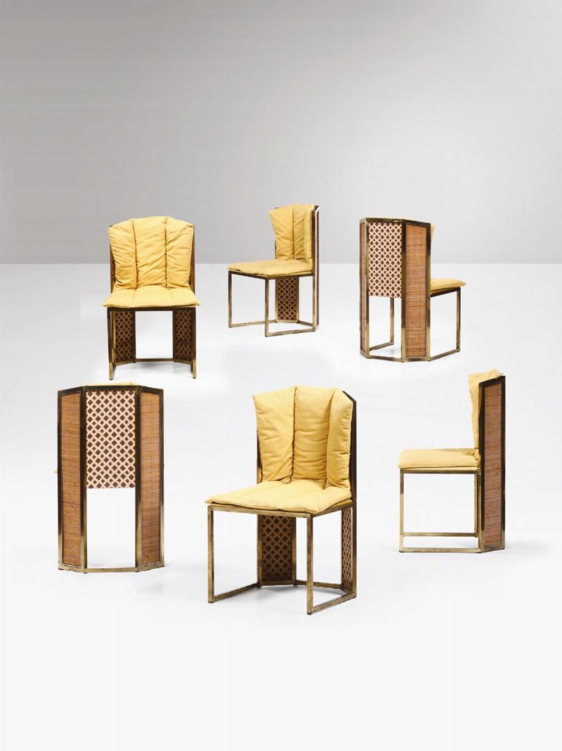 Sei sedie con struttura in ottone e rivestimenti in midollino. Sedute rivestite in tessuto.