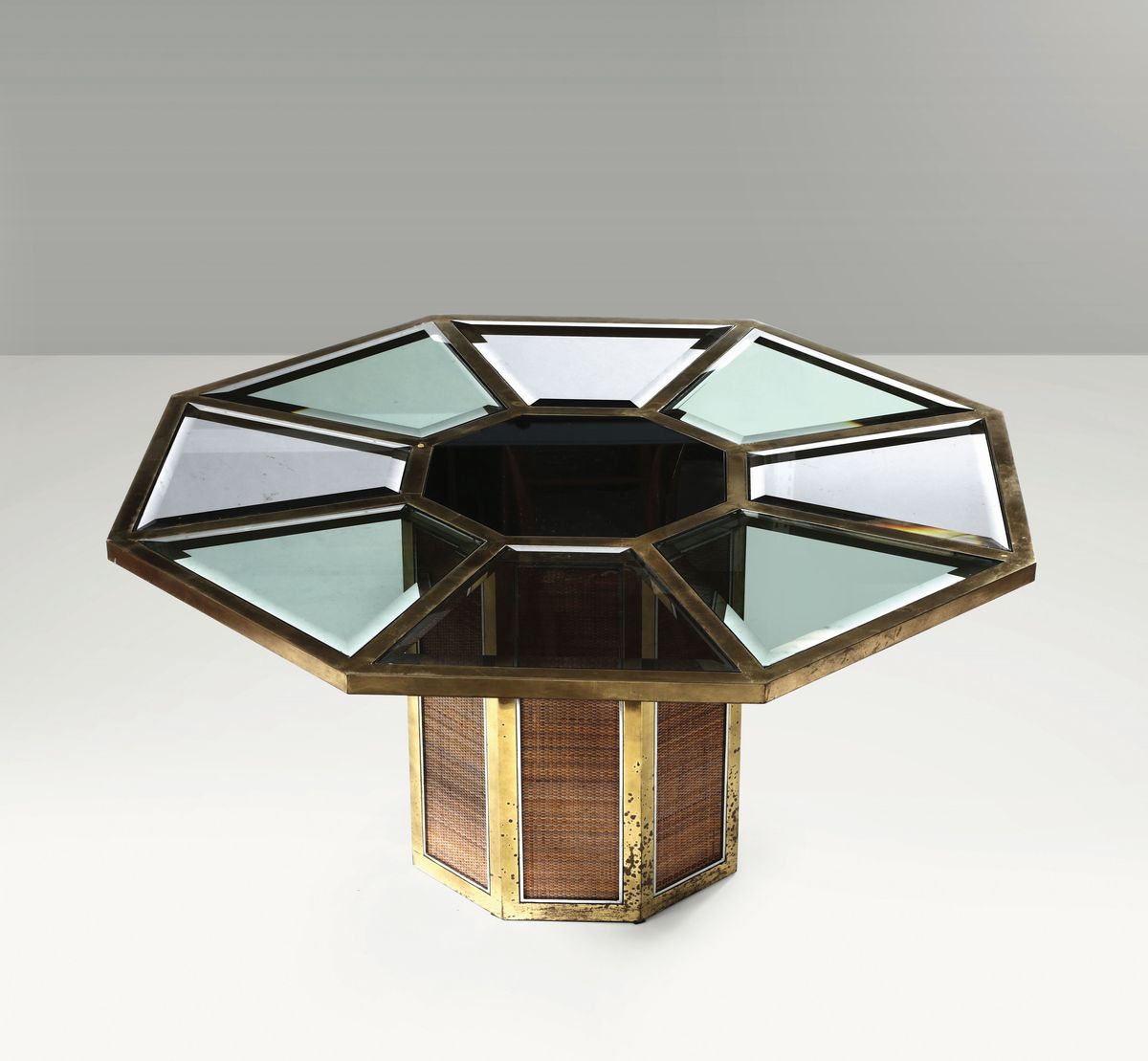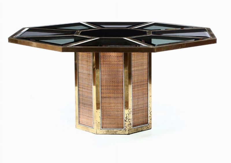 Tavolo con struttura in ottone e midollino. Piani in vetro colorato.