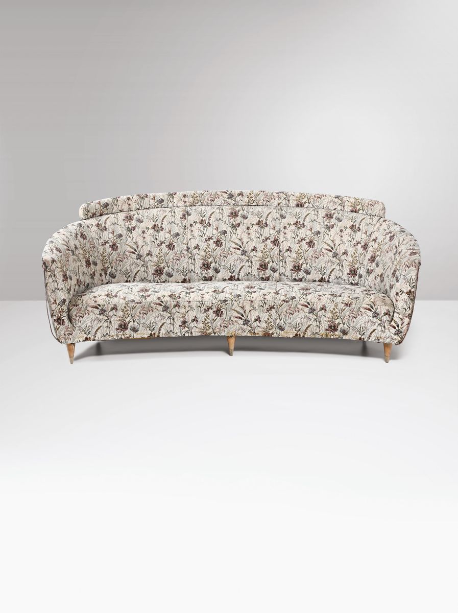 Salotto composto da coppia di poltrone e divano con struttura in legno e rivestimenti in tessuto.