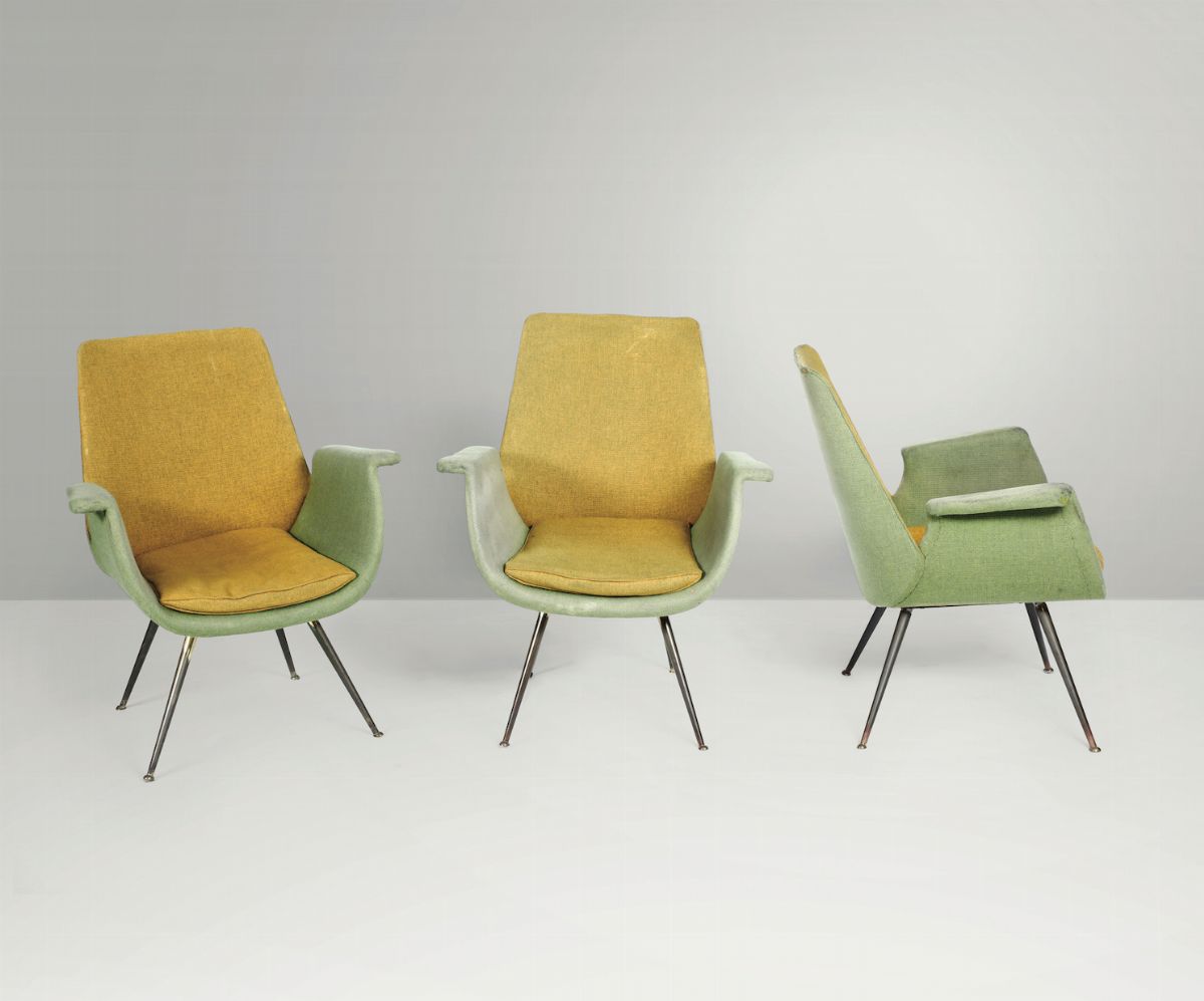 Tre poltrone con struttura in legno, rivestimenti in tessuto e sostegni in ottone.