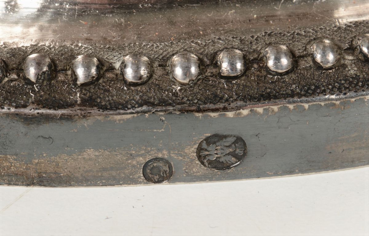 Altezza cm 25; gr. 430. Piede circolare gradinato e perlinato, decorato sul collo con i simboli della Passione di Cristo e con testine angeliche che si ripetono sul nodo e, alternate a grappoli d’uva, nel sottocoppa