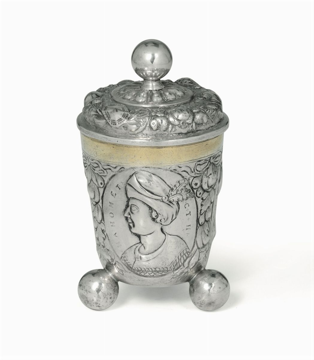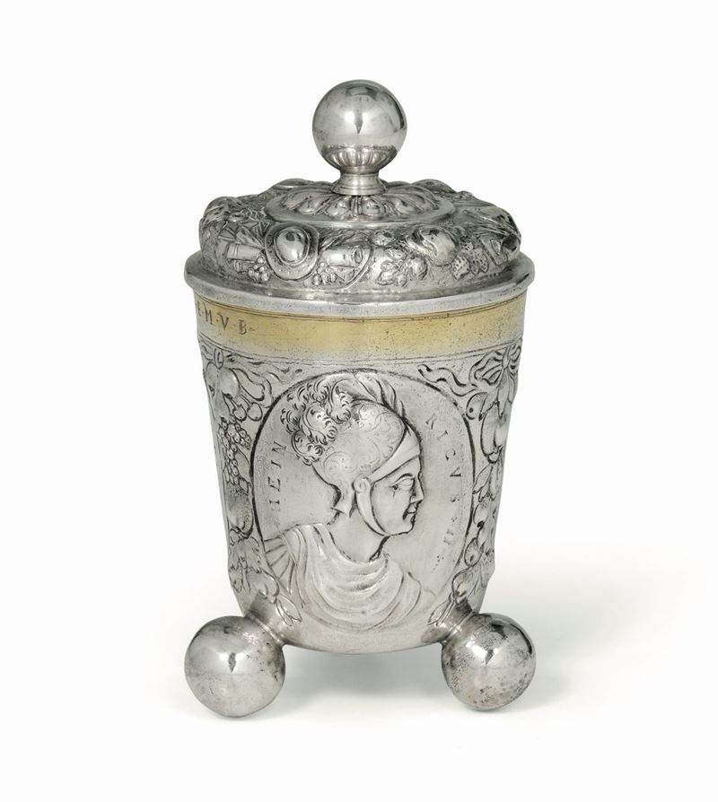 Coppa con coperchio in argento fuso, sbalzato, cesellato e dorato. Germani XVIII secolo, bollo camerale e dell’argentiere PW (non identificato)