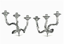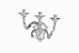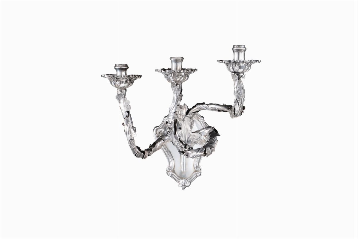 Coppia di appliques da illuminazione a tre bracci in argento fuso, sbalzato e cesellato. Genova, terzo quarto del XVIII secolo. Bollo della Torretta con datario 1767