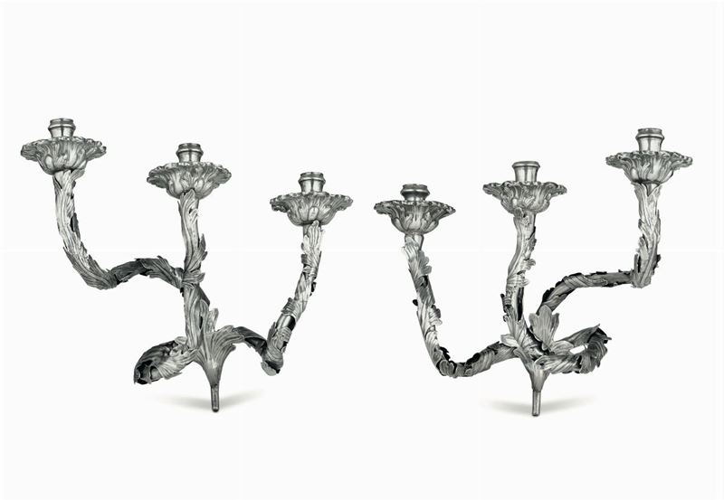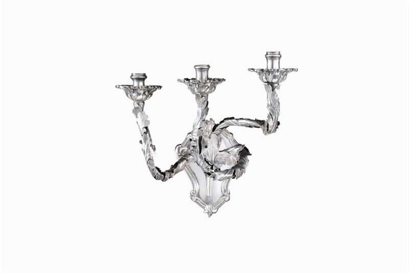 Coppia di appliques da illuminazione a tre bracci in argento fuso, sbalzato e cesellato. Genova, terzo quarto del XVIII [..]