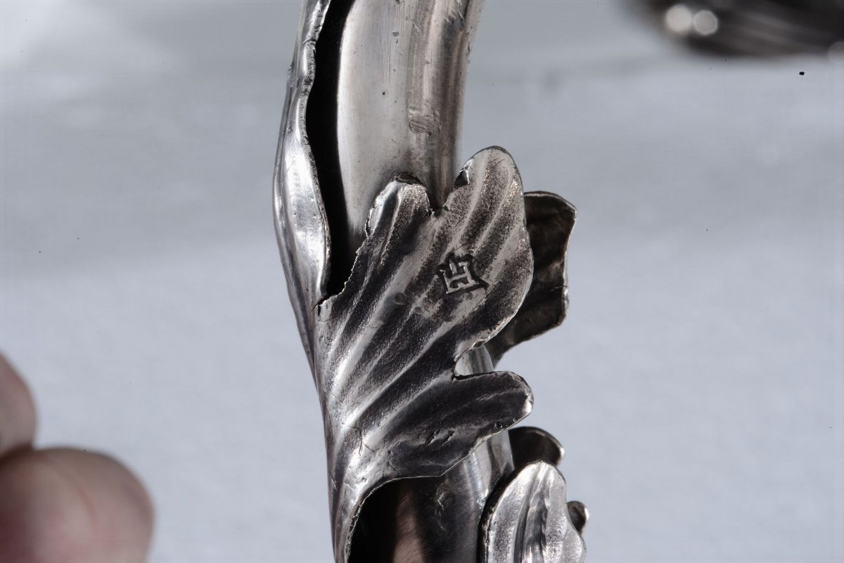 I ricchi elementi naturalistici a carattere fogliaceo che si avvinghiano come ad un tralcio virtuosamente sagomato in curvature asimmetriche terminanti in bobeches composte da corolla di foglie corrispondono in modo eccezionale al gusto barocchetto genovese imperante nella metà del XVIII secolo. Questo raro e raffinato esempio di argenteria nata per illuminare sale e salotti nel rinnovato spirito delle dimore settecentesche ben testimonia la notiria ricchezza e lo sforzo degli apparati e degli arredi delle dimore genovesi del passato.