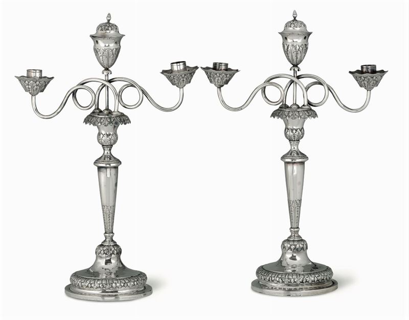 Coppia di candelabri a tre fiamme in argento sbalzato e cesellato. Genova, XIX secolo. Marchio di garanzia della Zecca in uso dal 1824 al 1872 (delfino arrotolato).