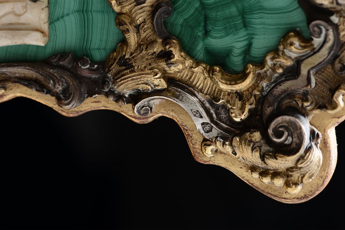 Crocifisso con Corpus Christi in avorio su croce in rame dorato, argento e malachite. Roma, seconda metà del XIX secolo, bollo camerale in uso dal 1815 al 1870 e bollo dell’argentiere GZ entro losanga (non identificato)