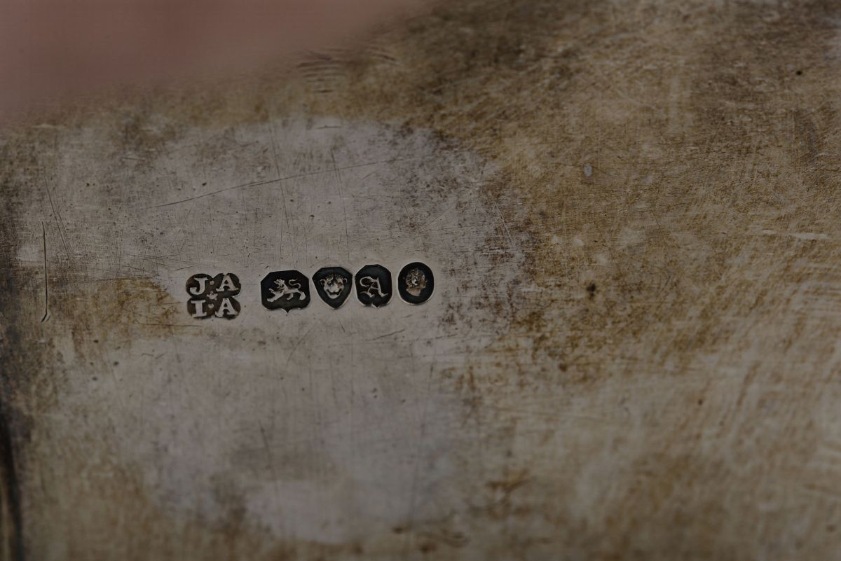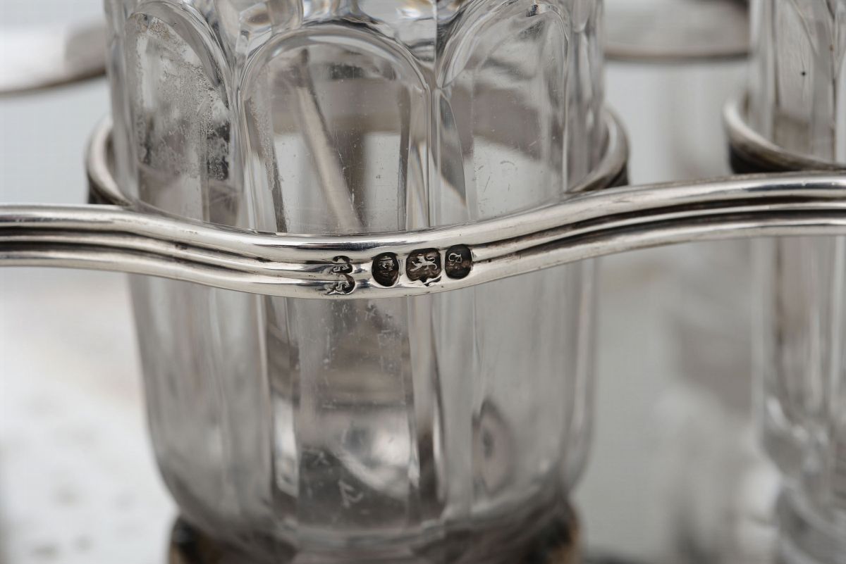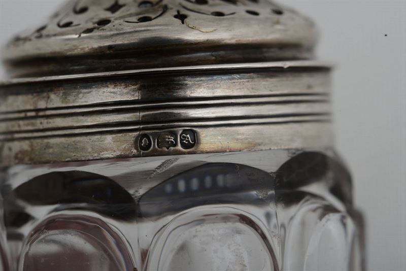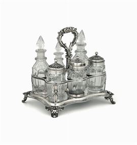 Cruet set in argento fuso, sbalzato e cesellato, Londra 1836, argentiere Joseph Angell sr. & John Angell,