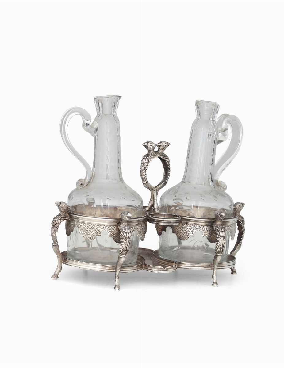 Porta ampolle con presa con elementi trapezofori a foggia di pappagalli. Sul bordo alto grembiulino sagomato e inciso con motivi romboidali. Ampolle in vetro decorate a molatura.