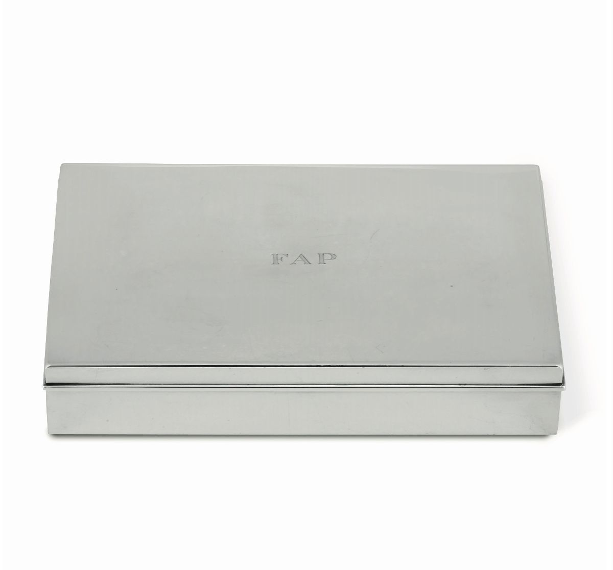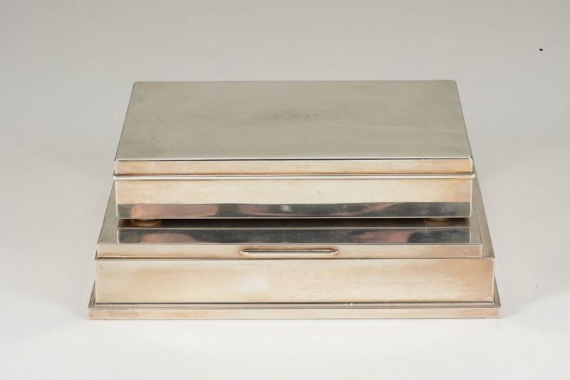 Una scatola portasigarette rettangolare in argento sterling con interno in legno Tiffany USA XX secolo ed una scatola porta fiches in argento sterling con interno in legno. Italia, Firenze seconda metà XX secolo