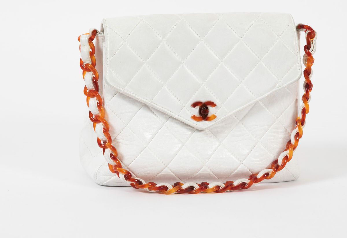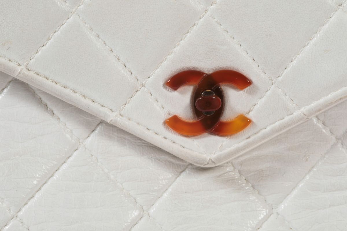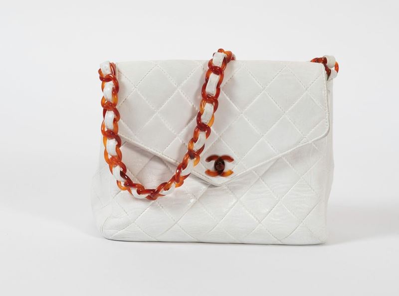 in pelle bianca,manico e chiusura in plastica,cm 23x20,dustbag originale e certificato di originalità, lievi difetti all’interno dovuti al tempo,no macchie