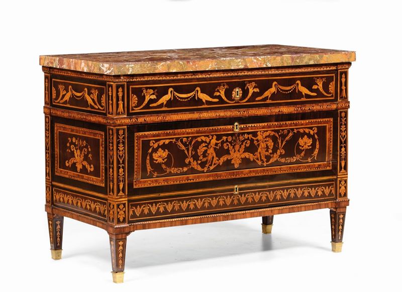 Coppia di cassettoni impiallacciati ed intarsiati in essenze pregiate, Genova fine XVIII secolo