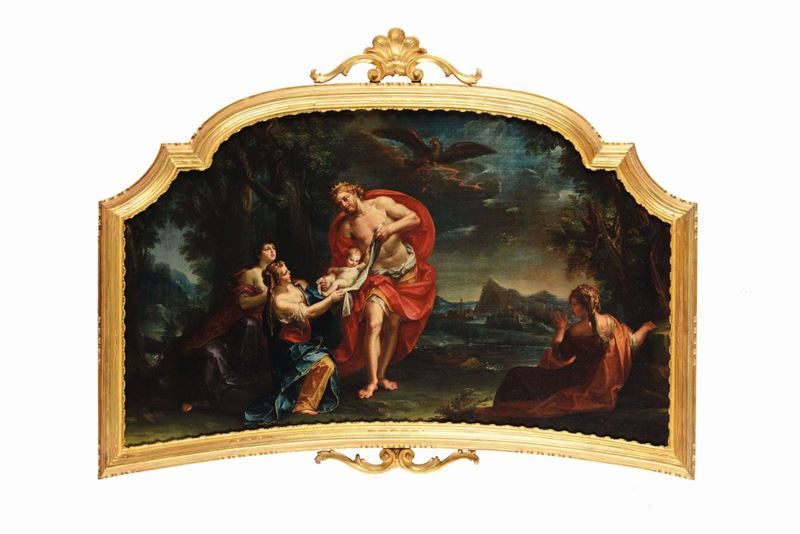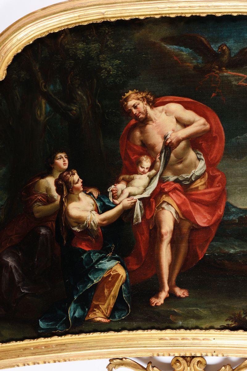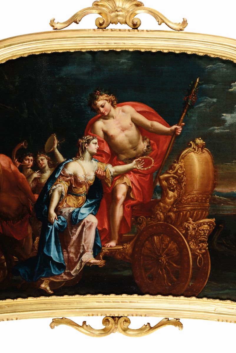 Giuseppe Marchesi, soprannominato il Sansone per la sua corporatura imponente, fu apprendista nella bottega di Marcantonio Franceschini. Se dal maestro apprese subito la misurata composizione delle figure nello spazio, da subito il suo stile grafico invece si differenzio' da quello, mostrando un disegno più mosso e meno idilliaco e classico, che porto' Marchesi ad essere considerato dagli anni 10 del '700 un pittore più moderno e aggiornato, vicino alle tendenze post-barocche che in Francia e Austria già andavano per la maggiore. Dopo aver lavorato per pale oggi a Macerata (Apparizione della Madonna a San Filippo Neri, 1733) e a Forlì (S. Filippo venera la Vergine, 1735), il Marchesi affronta la sua prima vera grande commissione pubblica che lo consacrerà in patria ma anche fuori: la decorazione dell'abside e della volta della Chiesa della Madonna di Galliera, presso le mura dell'omonima porta della città di Bologna. La notorietà che ricevette grazie a questa grandiosa opera, gioiello ancora oggi apprezzatissimo, gli farà da richiamo per molte opere anche private, nelle quali i temi religiosi lasciano posto a soggetti più vari e profani, come ad esempio la coppia di tele con le storie di Giuditta (oggi presso la Pinacoteca Nazionale di Bologna) e queste che presentiamo in asta con due scene della vita di Bacco. Il dio ha perso completamente la sua aura immorale e satiresca, comportandosi da perfetto gentiluomo nella scena in cui invita Arianna a salire sul suo carro dorato. Nell'altra scena si assiste alla scena in cui il dio Bacco sta per essere consegnato in gran segreto a Ino, sorella della defunta Semele. Concepito infatti dall'unione di Giove con Semele, quest'ultima sarà uccisa con l'inganno da Giunone prima che il figlio veda la luce. A salvarlo ci penserà Giove, che per portarlo alla fine della gestazione, se lo nasconderà nella coscia, la quale infatti è posta in evidenza nel dipinto.