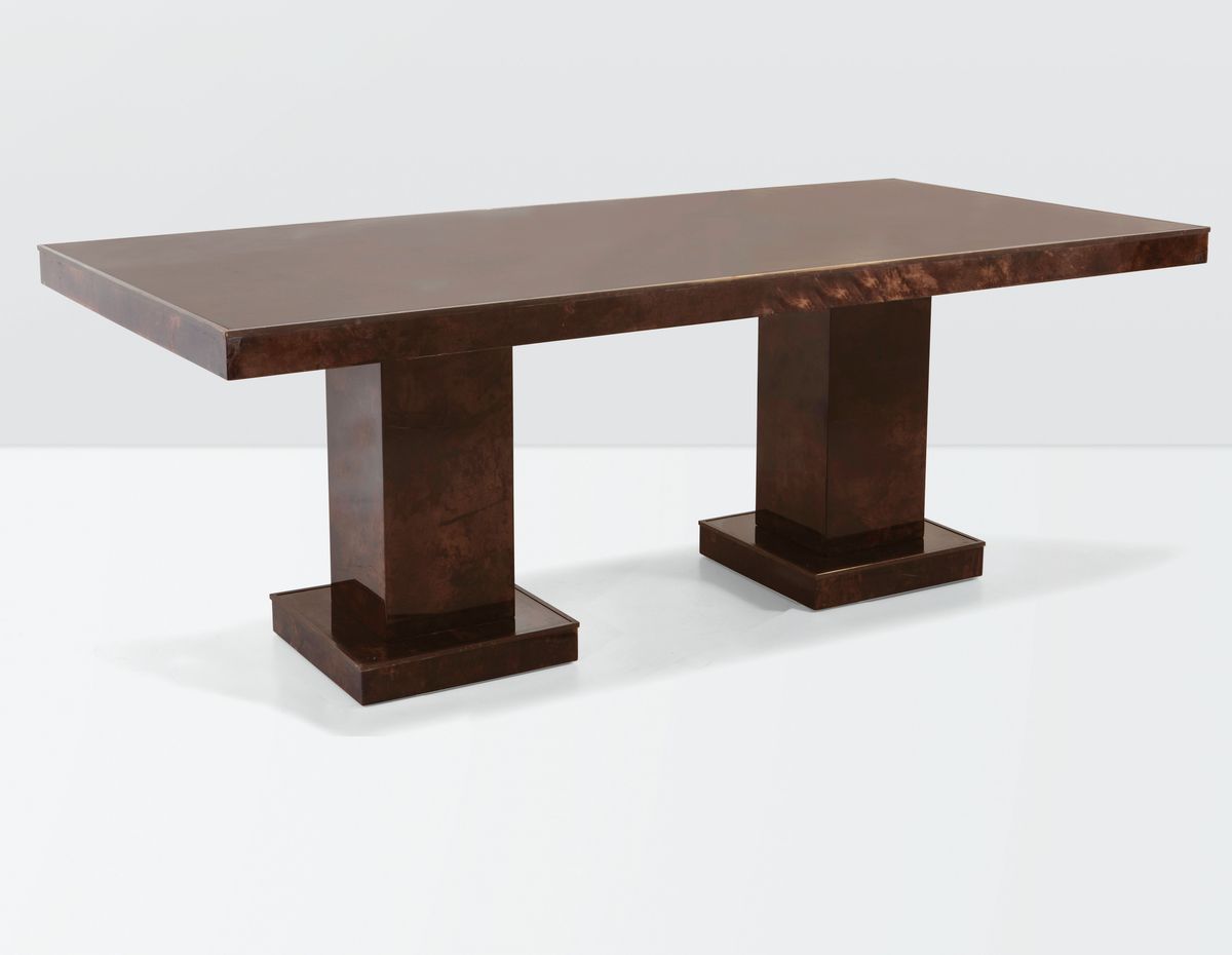 Tavolo con struttura in legno, rivestimenti in pergamena e dettagli in ottone.