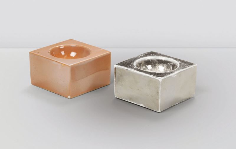 Coppia di posacenere quadrati in terraglia a colaggio smaltato. Edizione per Il Sestante. Marchio e firma sotto la base.