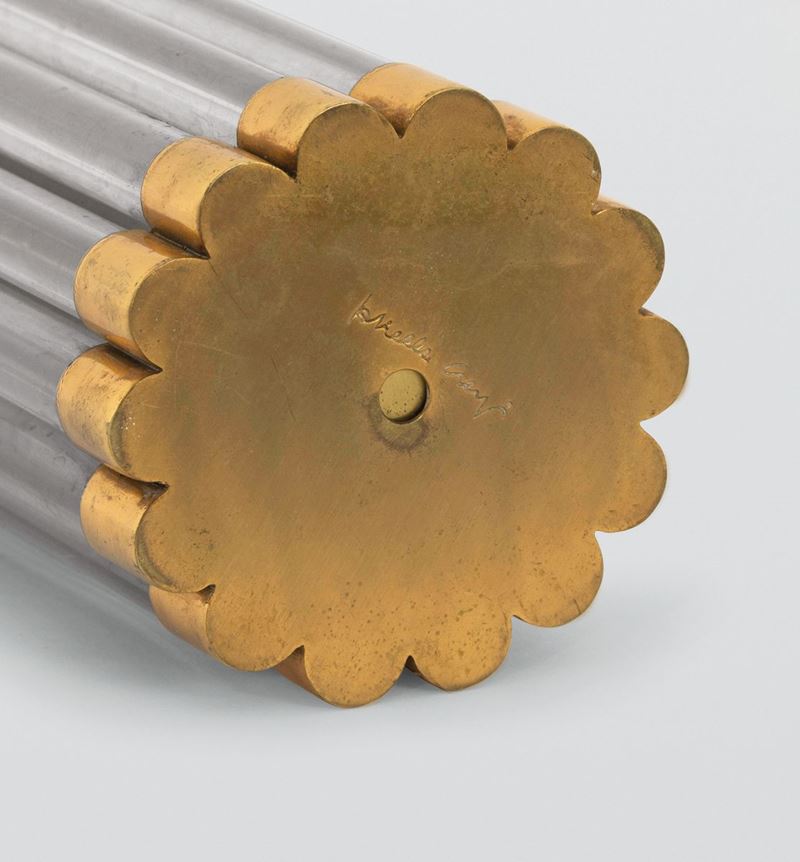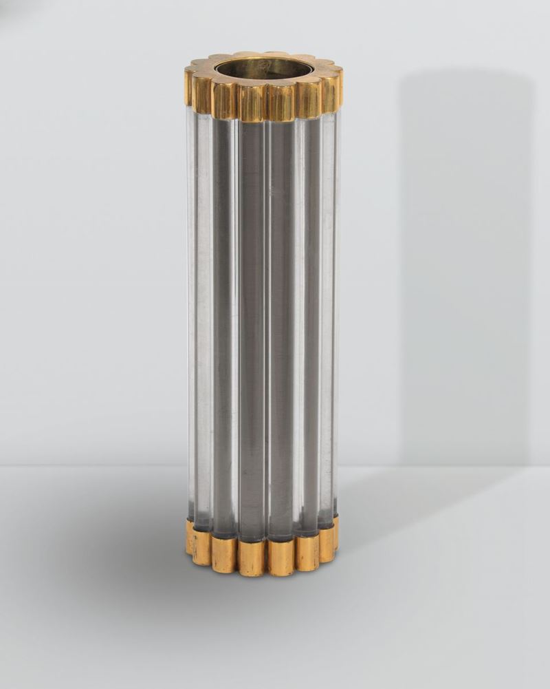 Vaso con struttura in vetro e ottone. Firma Incussa.