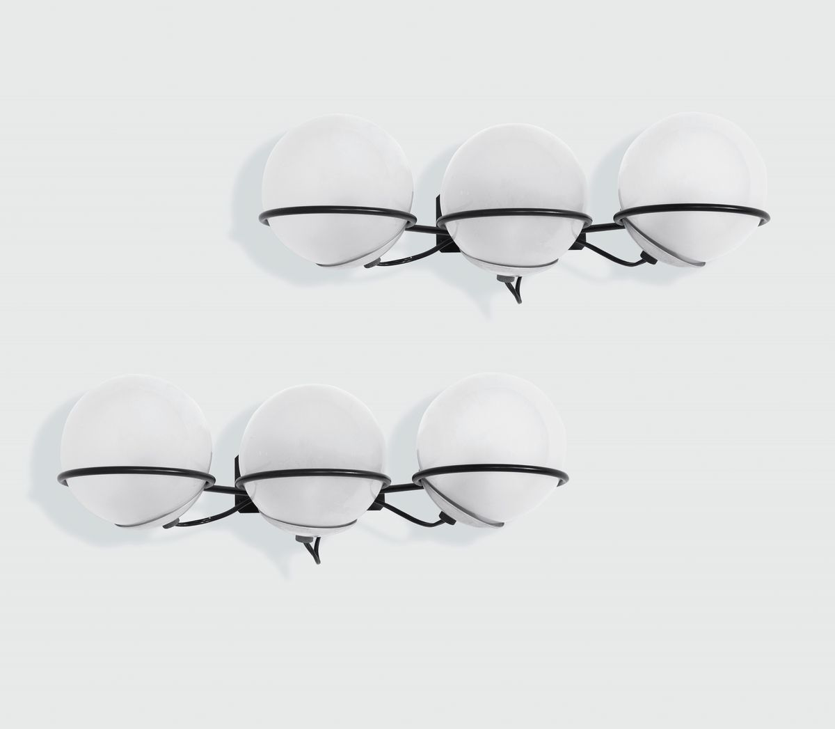 Due applique mod. 238/3 con struttura in metallo laccato e sfere in vetro satinato. Decalcomania originale.